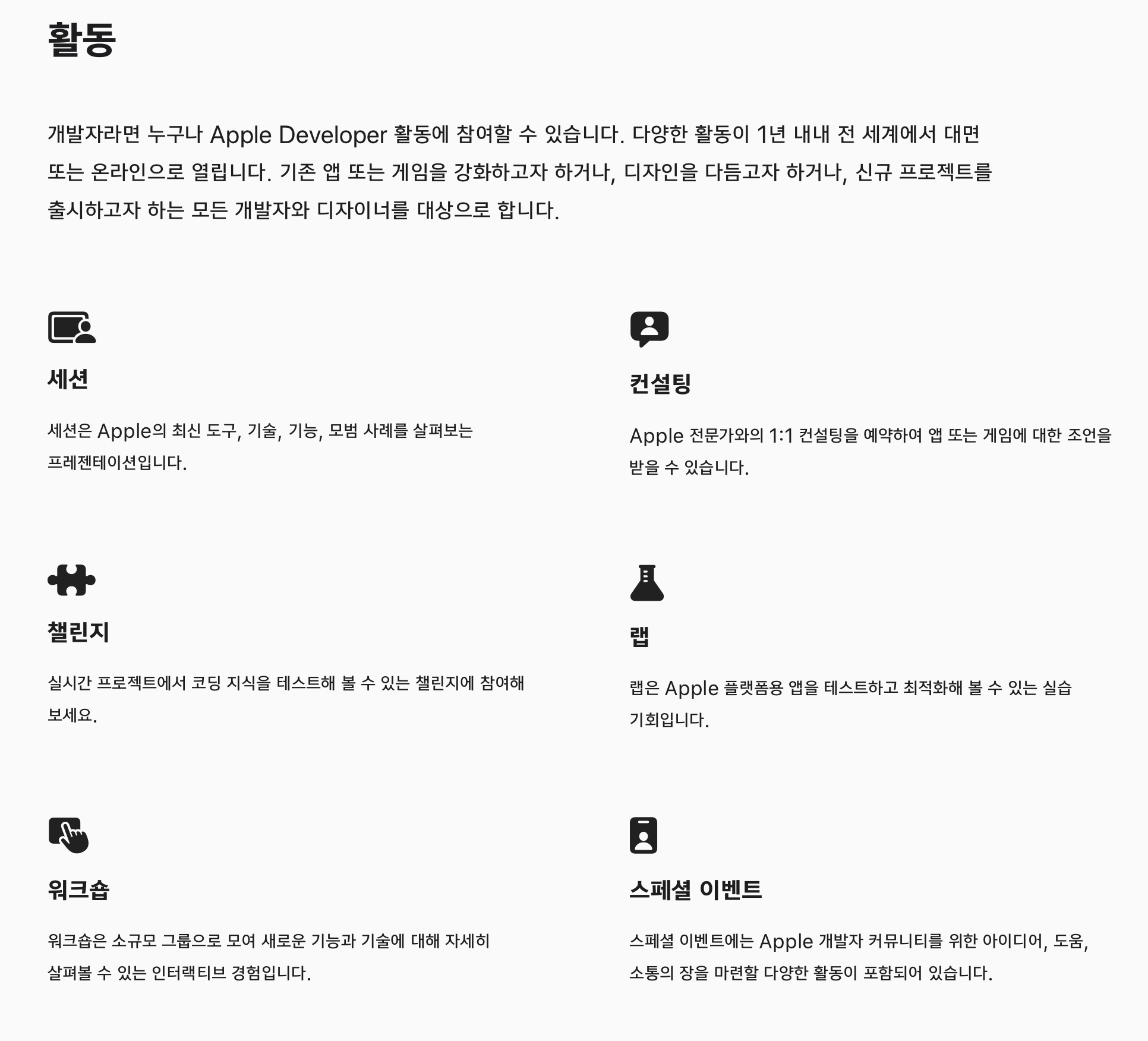 애플 전문가와의 만남 프로그램은 지금까지 개발자에게 수백 차례의 라이브 프레젠테이션과 수천 건의 일대일 상담을 제공한 Ask Apple, App Store 전문가와의 만남, 테크 토크 정보 시리즈의 성공에 힘입어 탄생했습니다. 상기 프로그램에서 다뤘던 주제를 이번 애플 애플 전문가와의 만남에서 확인할 수 있습니다.
