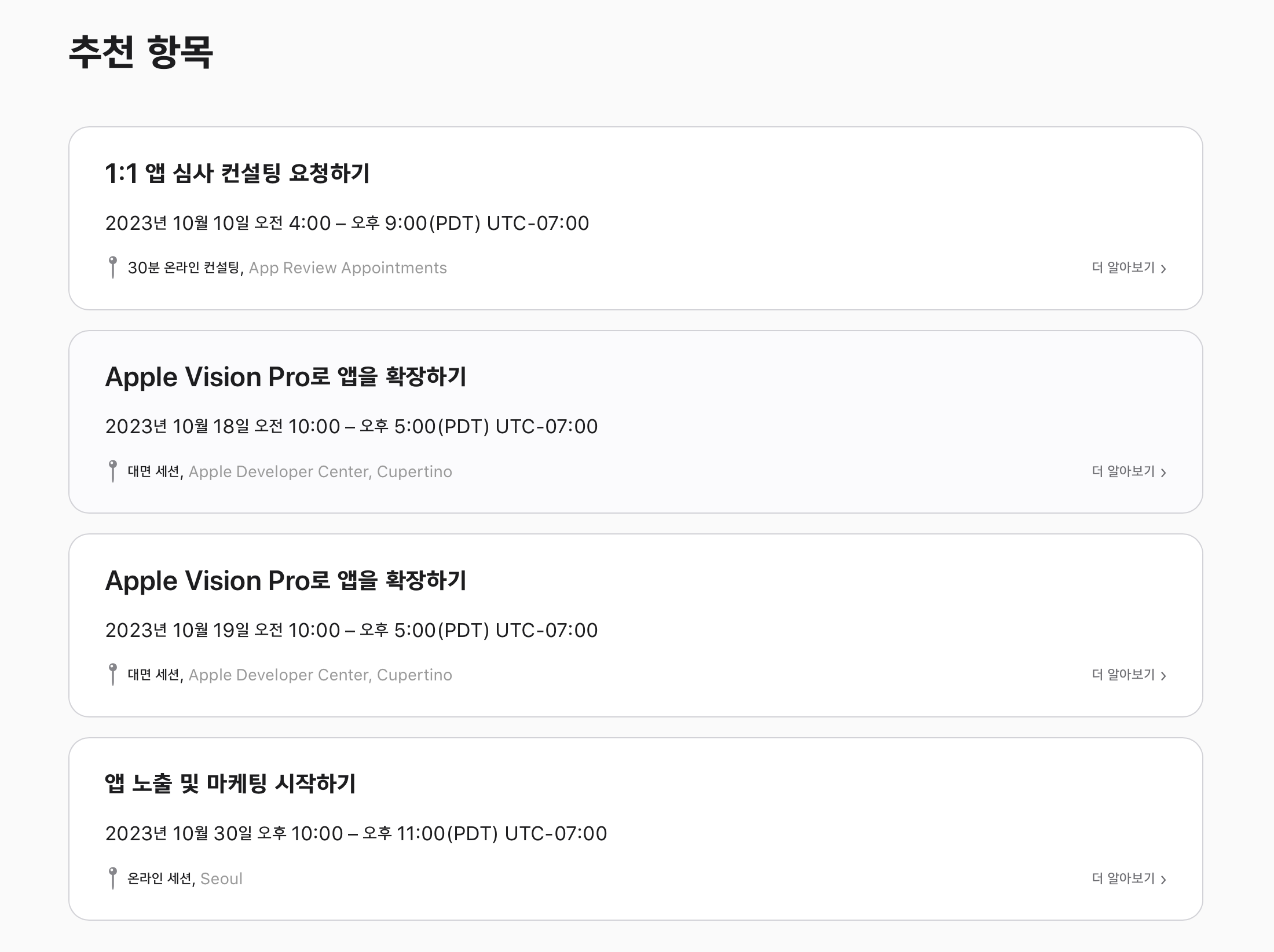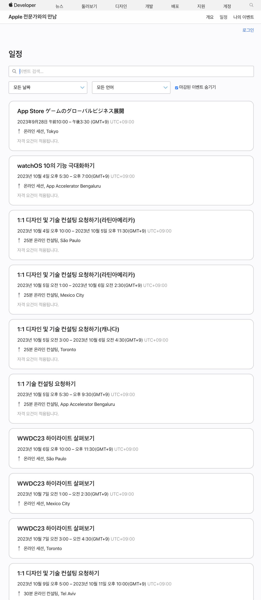 애플 전문가와의 만남은 Apple Developer Program 및 Apple Developer Enterprise Program의 현 회원은 https://developer.apple.com/kr/events/ 에서 최신 세션, 랩 및 특별 이벤트에 대한 자세한 정보 확인이 가능합니다.