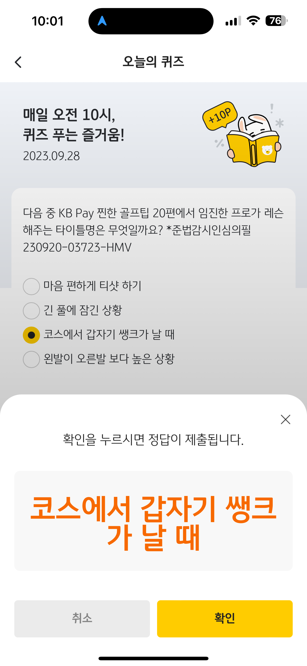 KB Pay 오늘의 퀴즈 정답은 코스에서 갑자기 쌩크가 날 때 입니다.