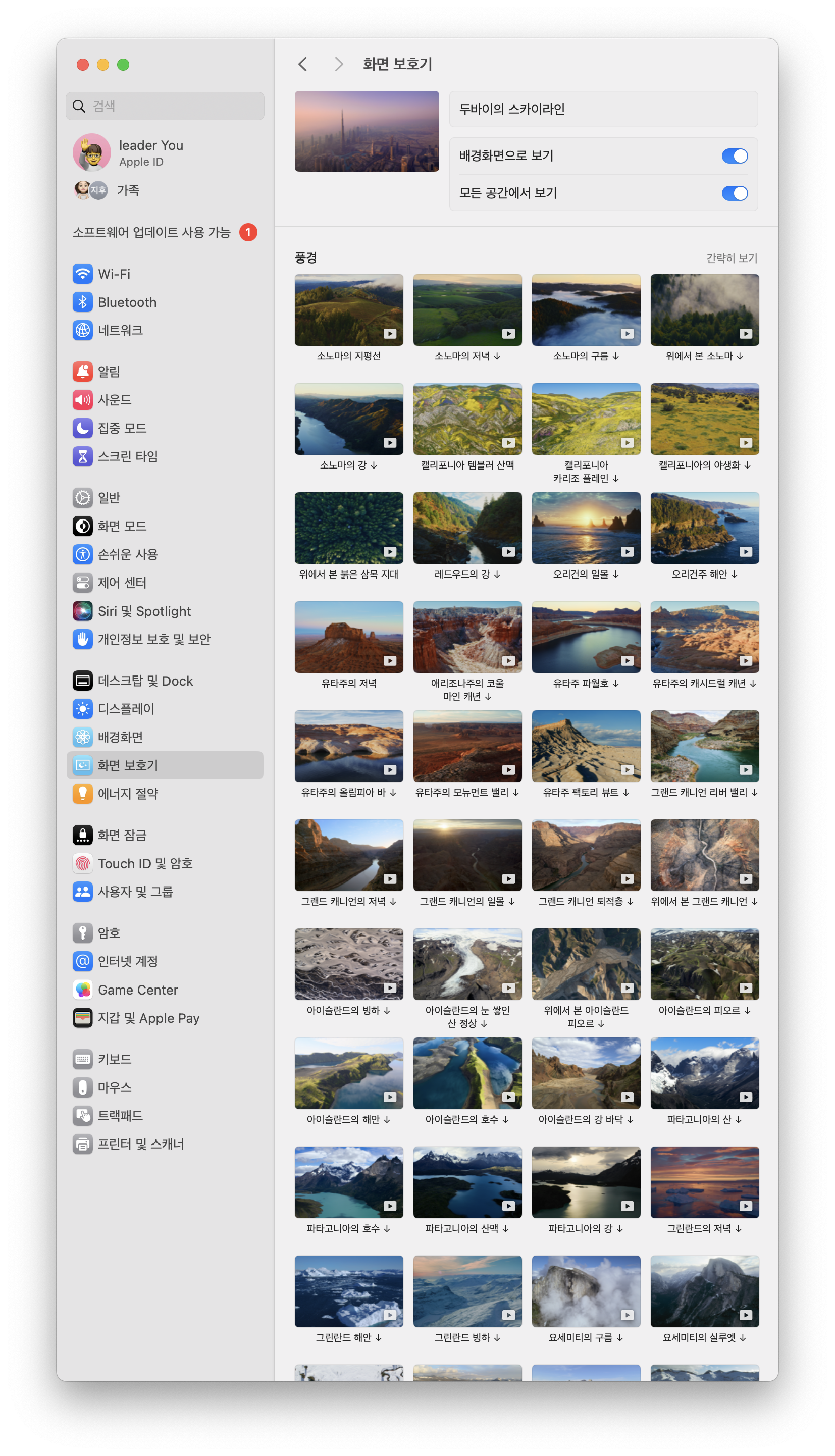 맥OS 소노마 macOS Sonoma 화면보호기 상태에서는 움직이는 영상이 나옵니다. 애플은 이번에 멋진 풍경, 도시 풍경, 수중 등 세계 곳곳의 장대한 광경이 담긴 화면 보호기를 넣었는데요. 이렇게 화면 보호기를 적용하면 PC 바탕화면(배경화면)까지 이어지는 효과를 통해 더욱 감성적인 맥(mac)을 사용할 수 있습니다.