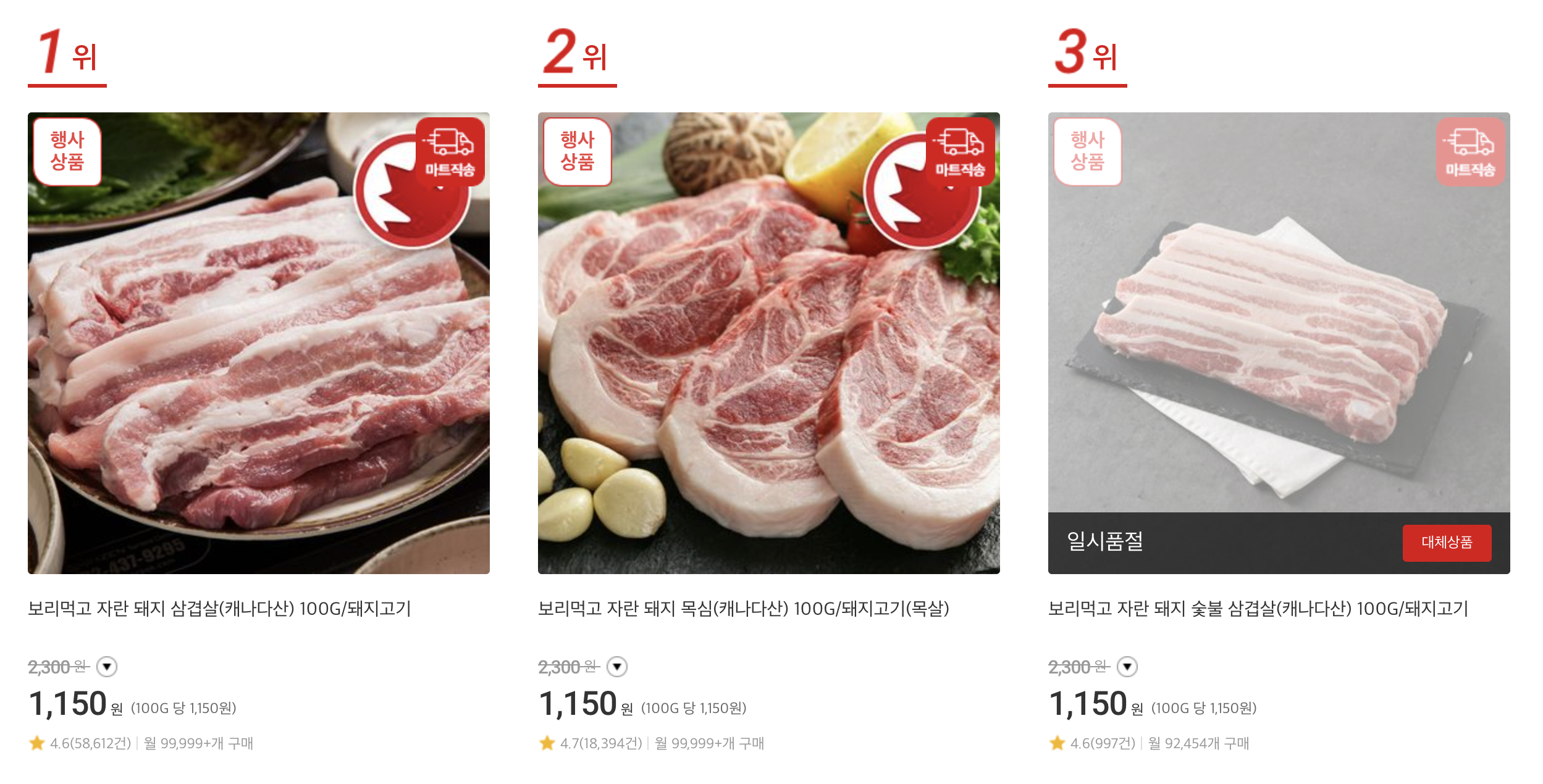 홈플러스는 매달 이 행사때문에 인기를 끌고 있는데요. 오늘도 오픈하자 마자 판매 베스트를 차지했습니다. 요즘 삽결살, 목살 가격 많이 비싸졌는데 50% 할인이면 정말 착한 가격이죠.