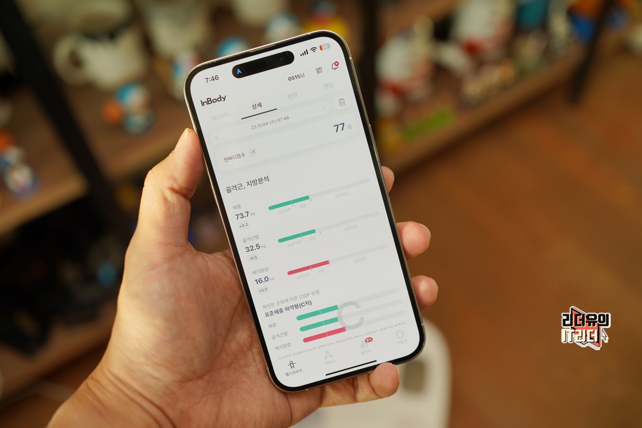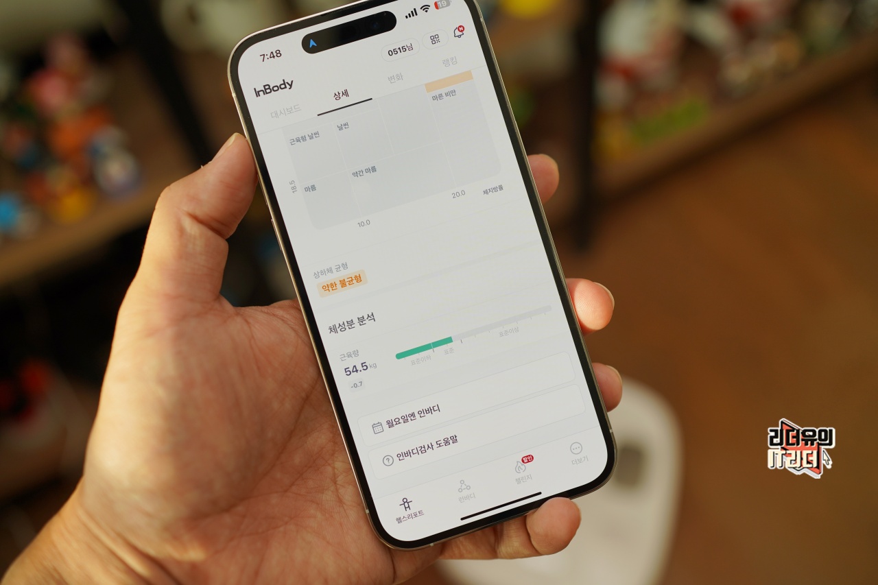 체성분 분석 결과도 볼 수 있습니다. 균육량이 얼마나 있는지 보여주는 결과입니다.