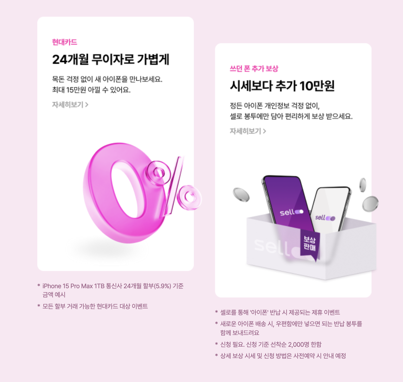 LG U+ 유플러스 아이폰15 / 아이폰15 프로 사전예약 혜택으로 현대카드만 24개월 무이자 혜택을 제공합니다. 카드사가 제한적이라는 아쉽습니다. 그리고 중고폰 보상으로 시세보다 추가 10만원을 제공한다고 합니다.