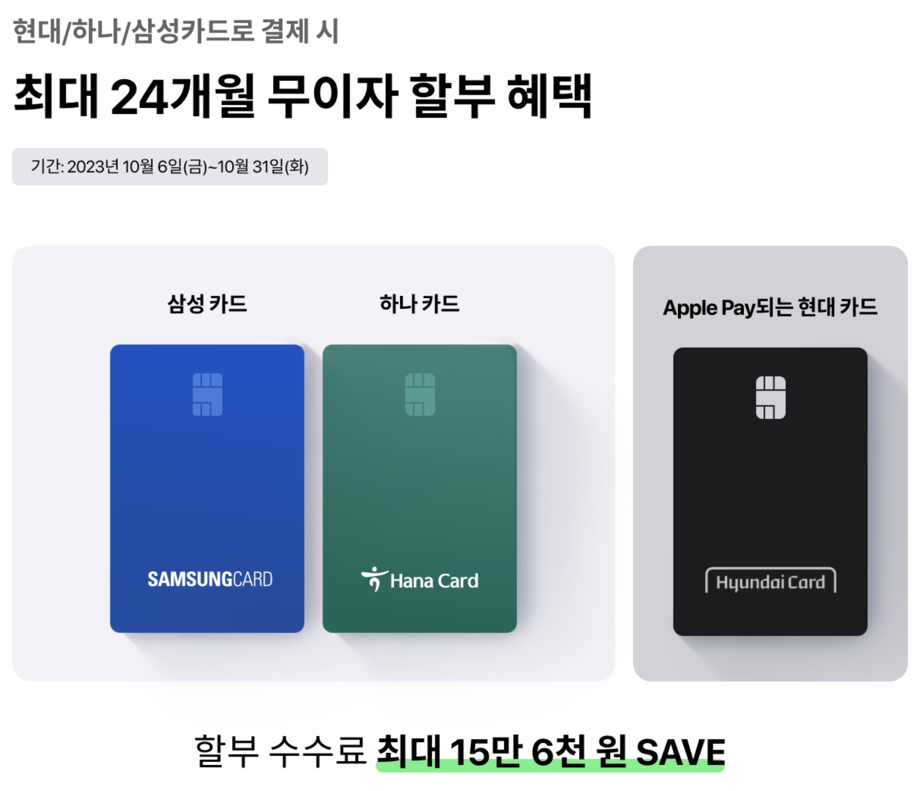 SKT 아이폰15 / 아이폰15 프로 사전예약 혜택으로 현대카드, 하나카드, 삼성카드는 최대 24개월 무이자 할부 혜택을 받을 수 있습니다. 카드사가 많지 않은 것은 아쉬우나 해당 카드를 보유한 사람들은 할부 수수료를 줄일 수 있습니다.