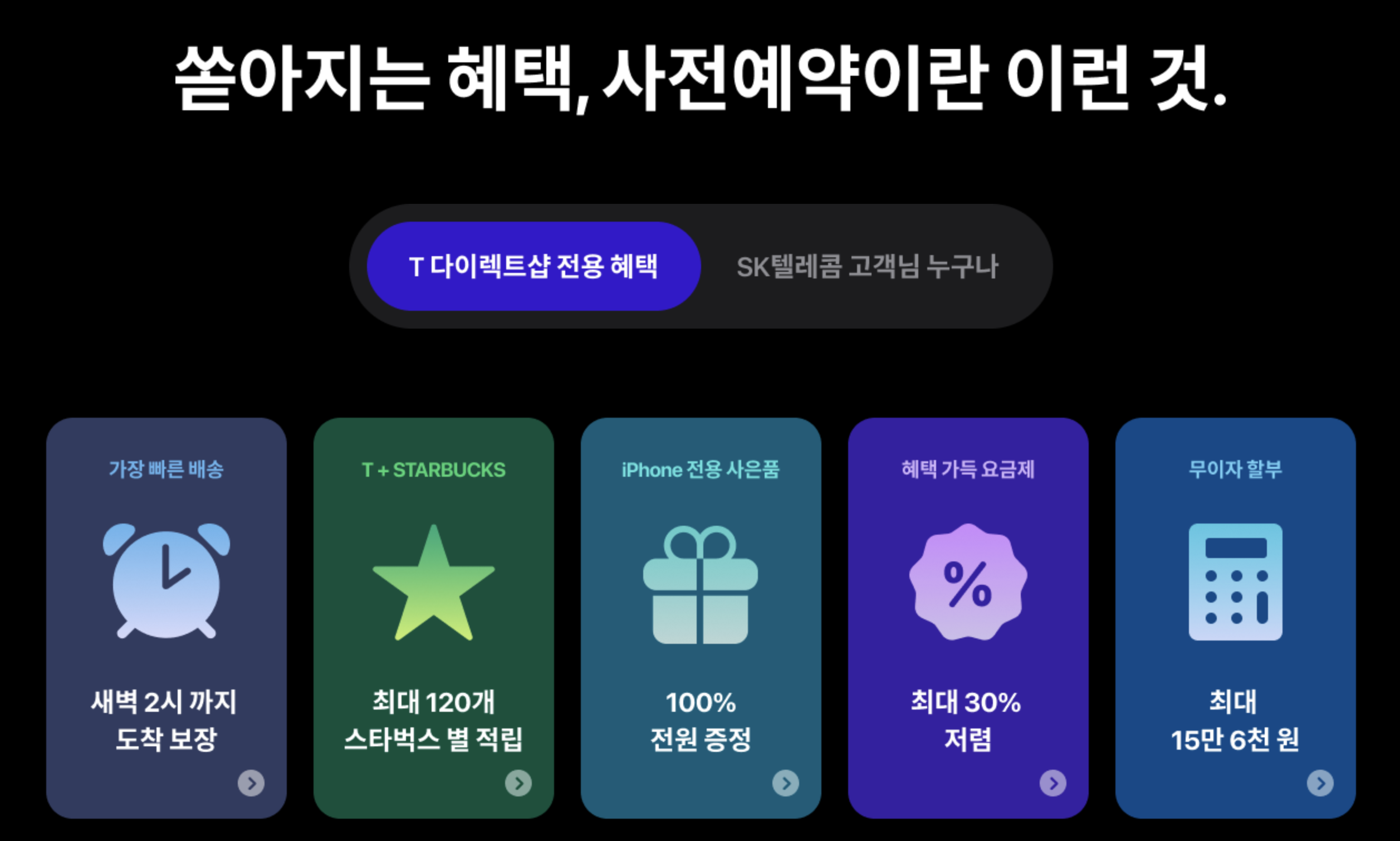 SKT 아이폰15 / 아이폰15 프로 사전예약 혜택은 가장 빠른 배송, 스타벅스 별 적립, 아이폰 전용 사은품, 무이자 할부를 강조하고 있습니다.