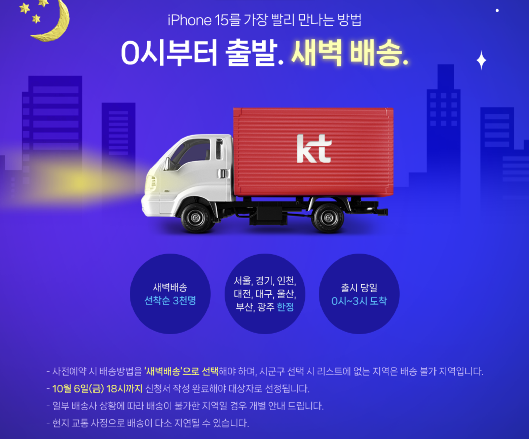 KT 아이폰15 / 아이폰15 프로 사전예약 혜택은 새벽배송을 새벽 3시까지 받을 수 있게 해준다고 합니다. SKT보다는 1시간 늦네요. 새벽 배송은 서울, 경기, 인천, 대전, 대구, 울산, 부산, 광주 한정으로 진행됩니다.