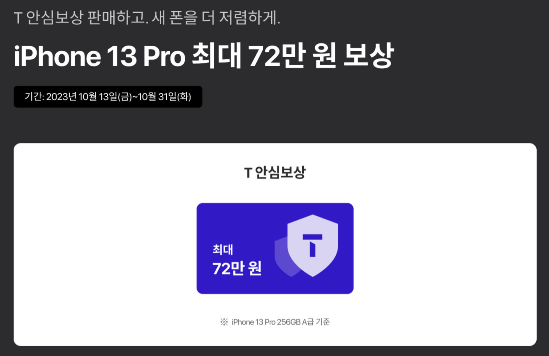 SKT 아이폰15 / 아이폰15 프로 사전예약 혜택으로 아이폰13 프로 256GB A급 기준 최대 72만원 보상을 받을 수 있는 혜택을 제공하고 있습니다. 직접 파는게 더 많이 받을 수 있겠지만 이렇게도 보상이 가능하니 참고해 두세요