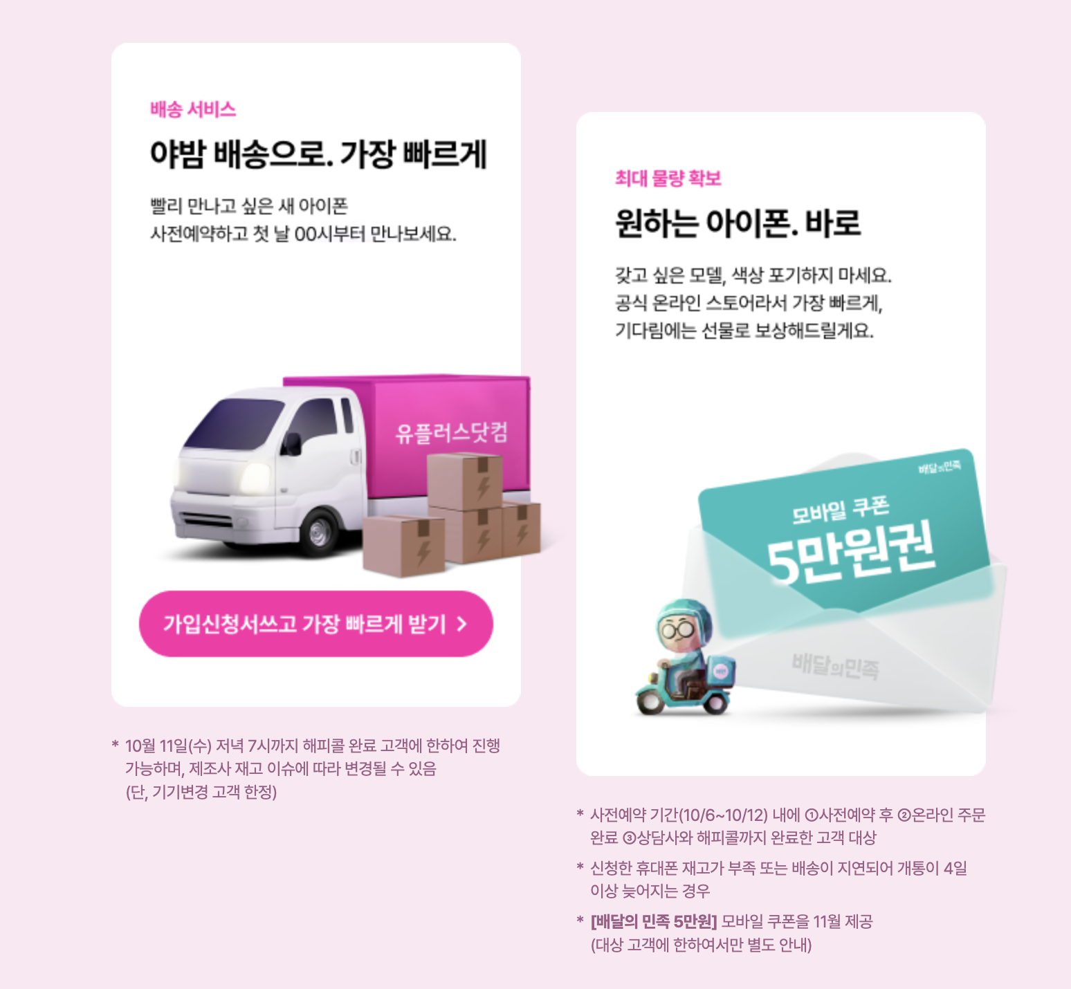 LG U+ 유플러스 아이폰15 / 아이폰15 프로 사전예약 혜택으로 야밤배송 혜택을 제공합니다. 첫날 00시부터 만날 수 있다고 하니 유플러스가 가장 빠르게 배송이 되는 것 같습니다. 그리고 혹시나 배송이 4일 이상 늦어지게 되면 배달의 민족 5만원권을 제공한다고 합니다.