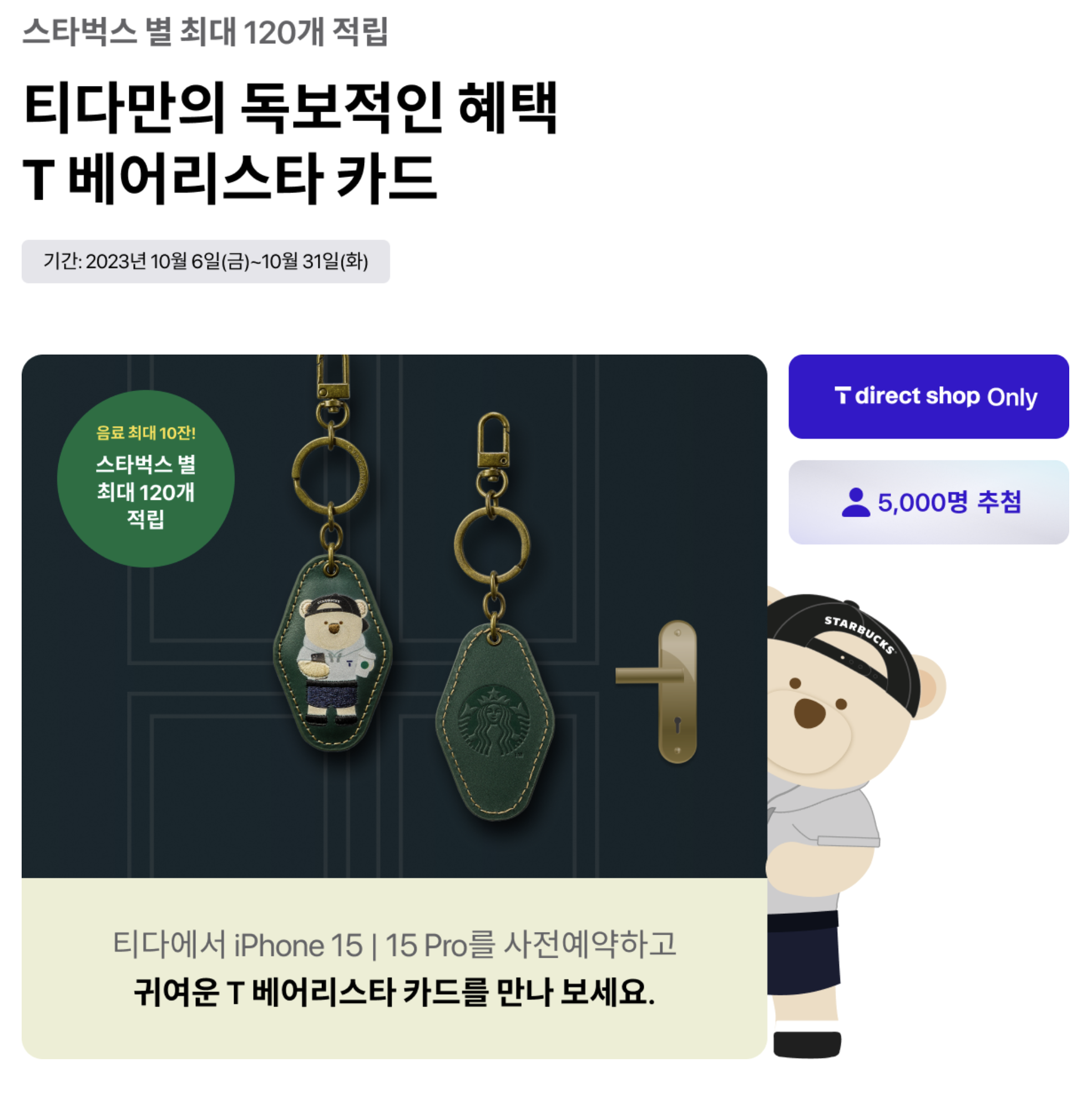 SKT 아이폰15 / 아이폰15 프로 사전예약 혜택으로 스타벅스 별 최대 120개 적립 혜택도 제공합니다. 음료 최대 10잔을 받을 수 있는 혜택이라고 합니다. 그리고 귀여운 T베어리스타 카드를 만날 수 있다고 합니다. 단, 5000명 추첨해서 제공한다고 합니다.