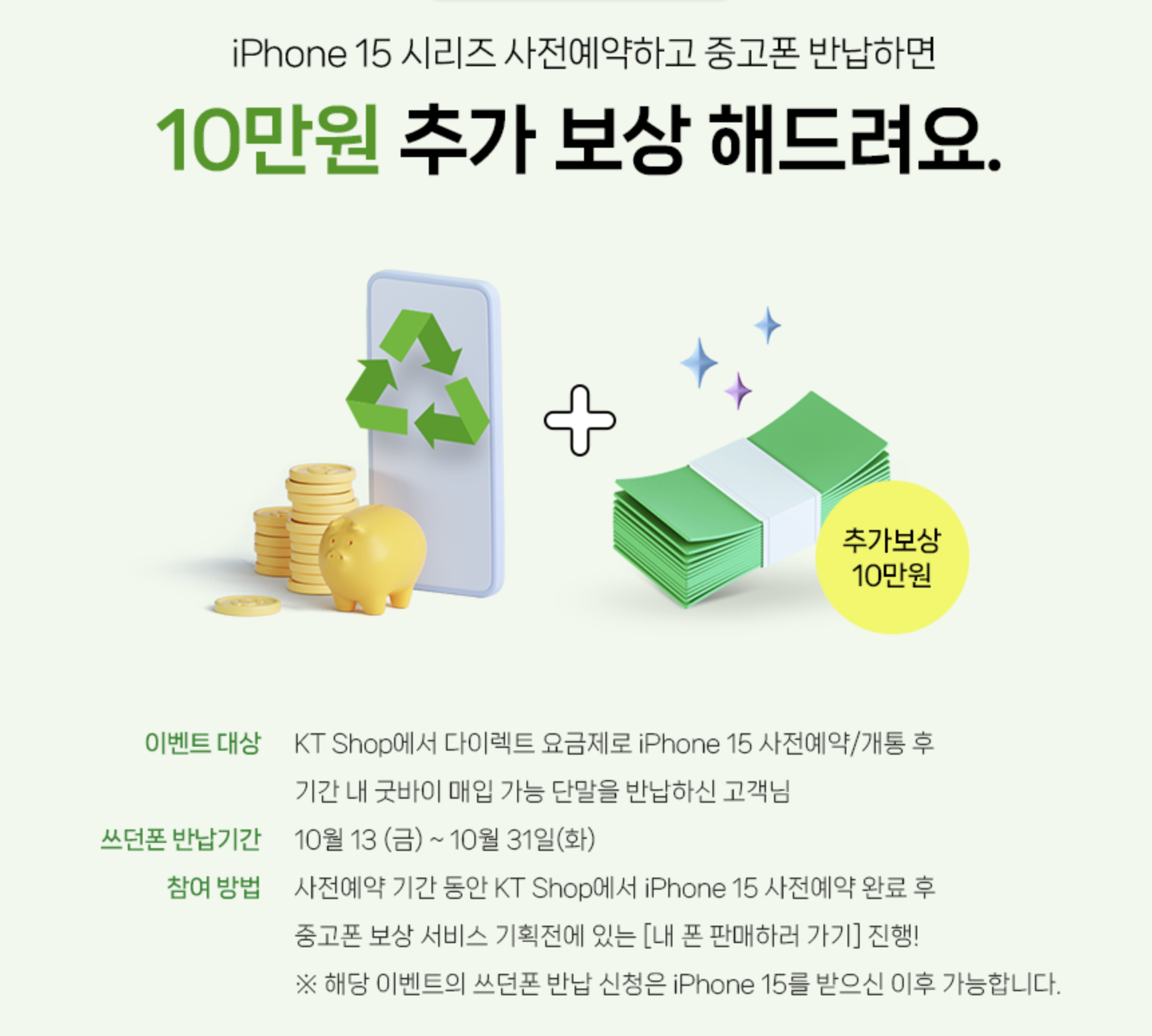 KT 아이폰15 / 아이폰15 프로 사전예약 혜택으로 다이렉트 요금제로 개통을 할 시 중고폰 반납하면 10만원 추가 보상을 해줍니다. 고가의 요금제를 써야 한다는 함정이 있긴 합니다.