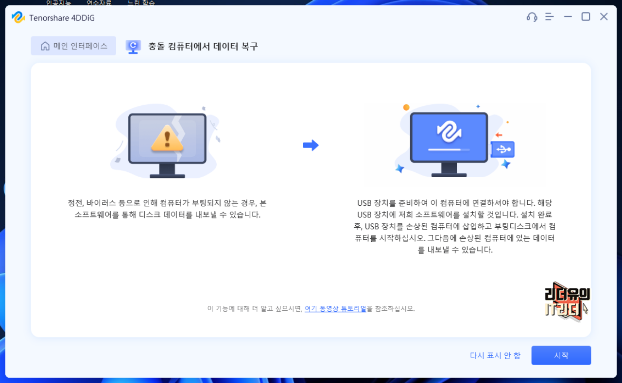 충돌 컴퓨터에서 데이터 복구도 쉽게 안내되어 있습니다. 정전, 바이러스 등으로 컴퓨터가 부팅되지 않는 경우 4DDiG 데이터 복구 프로그램으로 데이터 복구를 할 수 있습니다.