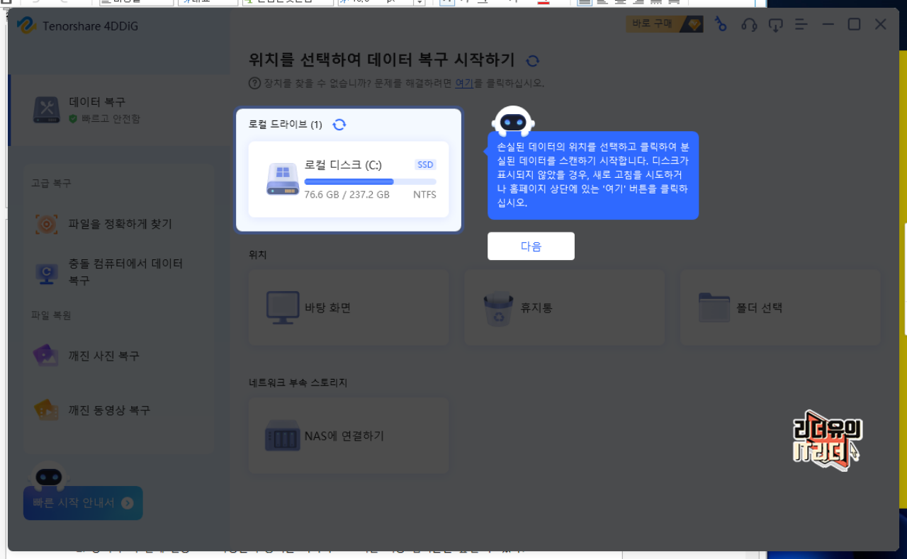 4DDiG 데이터 복구 서비스의 장점은 아주 친절하게 사용방법에 대해 가이드를 하고 있다는 것입니다. 불친절한 데이터 복구 프로그램들이 많은데 이건 하나하나 초보자도 쉽게 이용할 수 있게 가이드하고 있어 누구나 쉽게 사용할 수 있습니다.