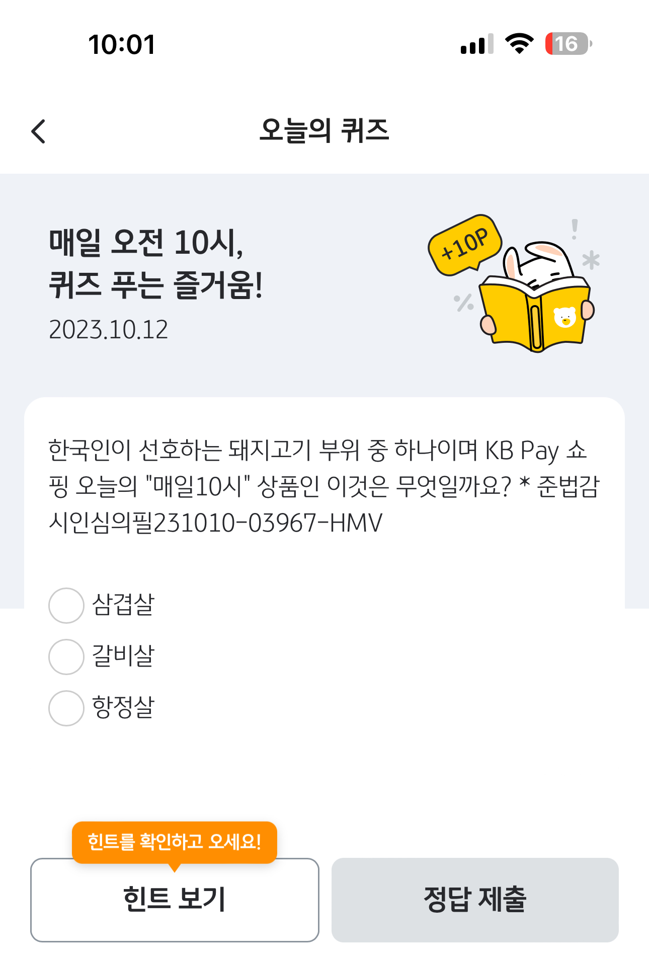 KB Pay 오늘의 퀴즈 정답은 삼겹살 입니다