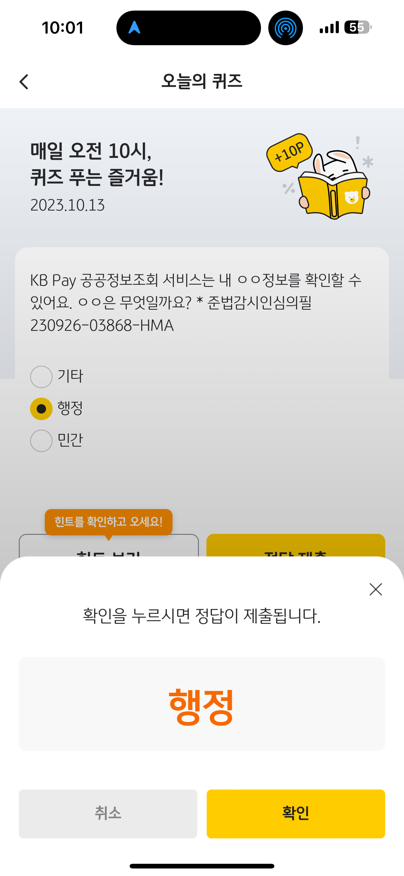 KB Pay 오늘의 퀴즈 정답은 행정 입니다