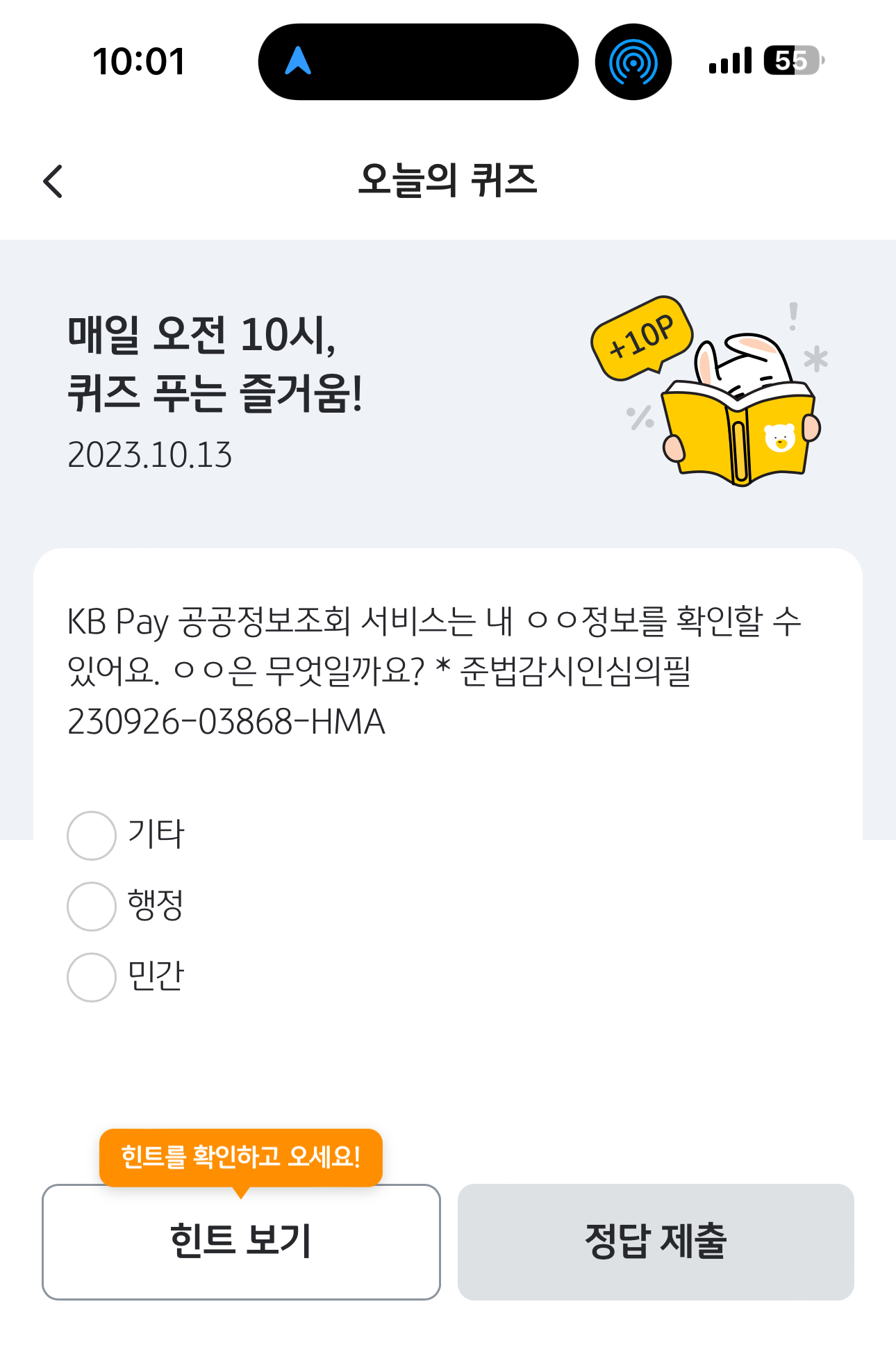 KB Pay 공공정보조회 서비스는 내 ㅇ ㅇ 정보를 확인할 수 있어요. ㅇ ㅇ 은 무엇일까요? * 준법감시인심의필 230926-03868-HMA 보기는 1. 기타 2. 행정 3. 민간 입니다.