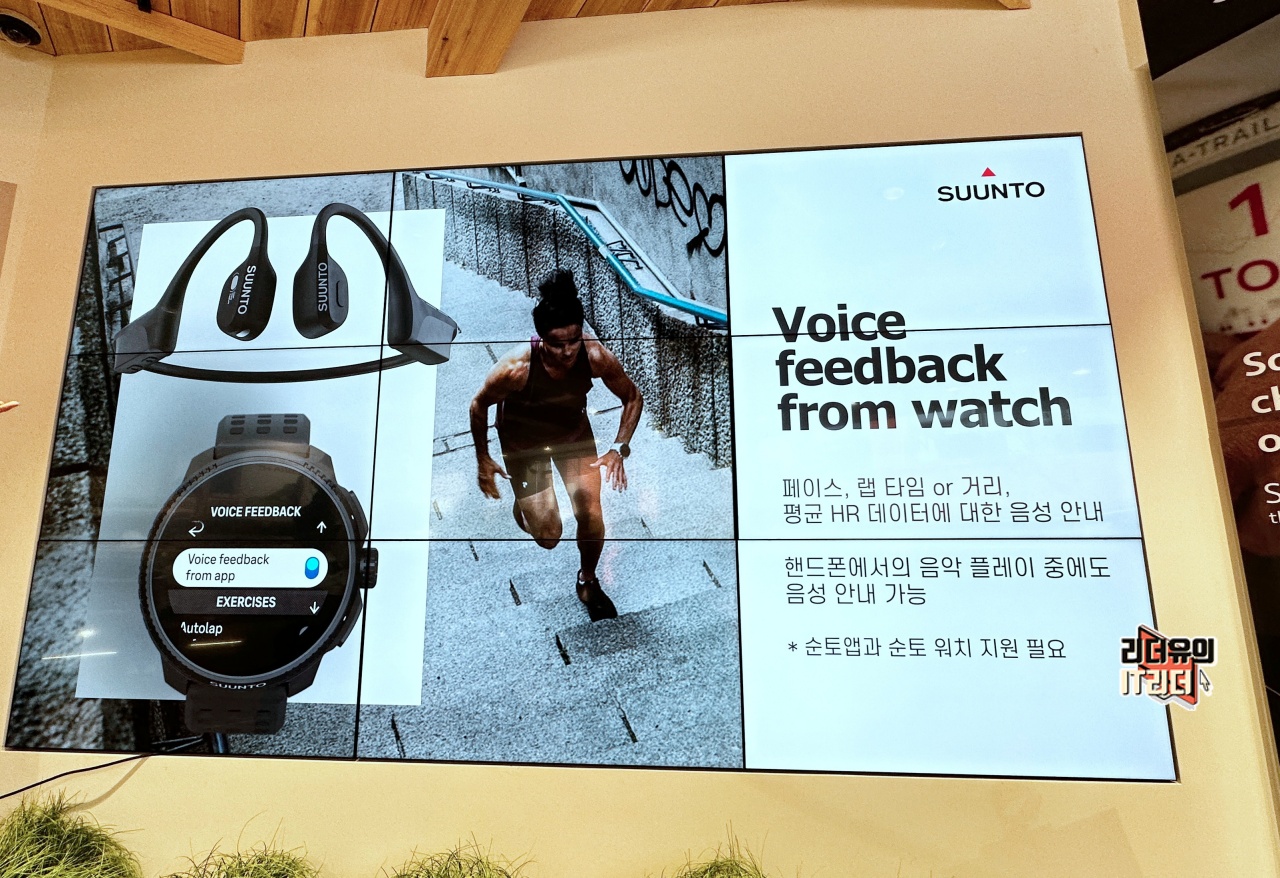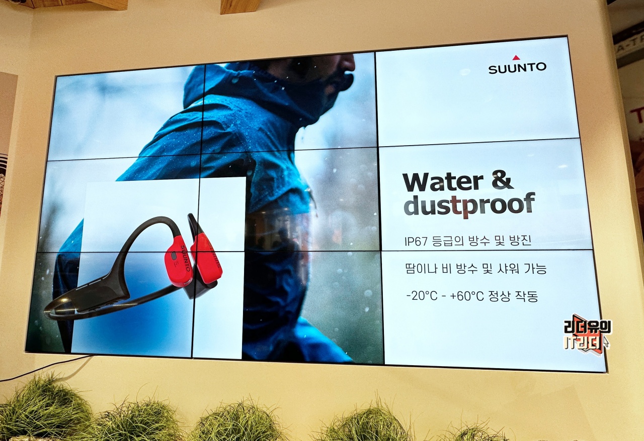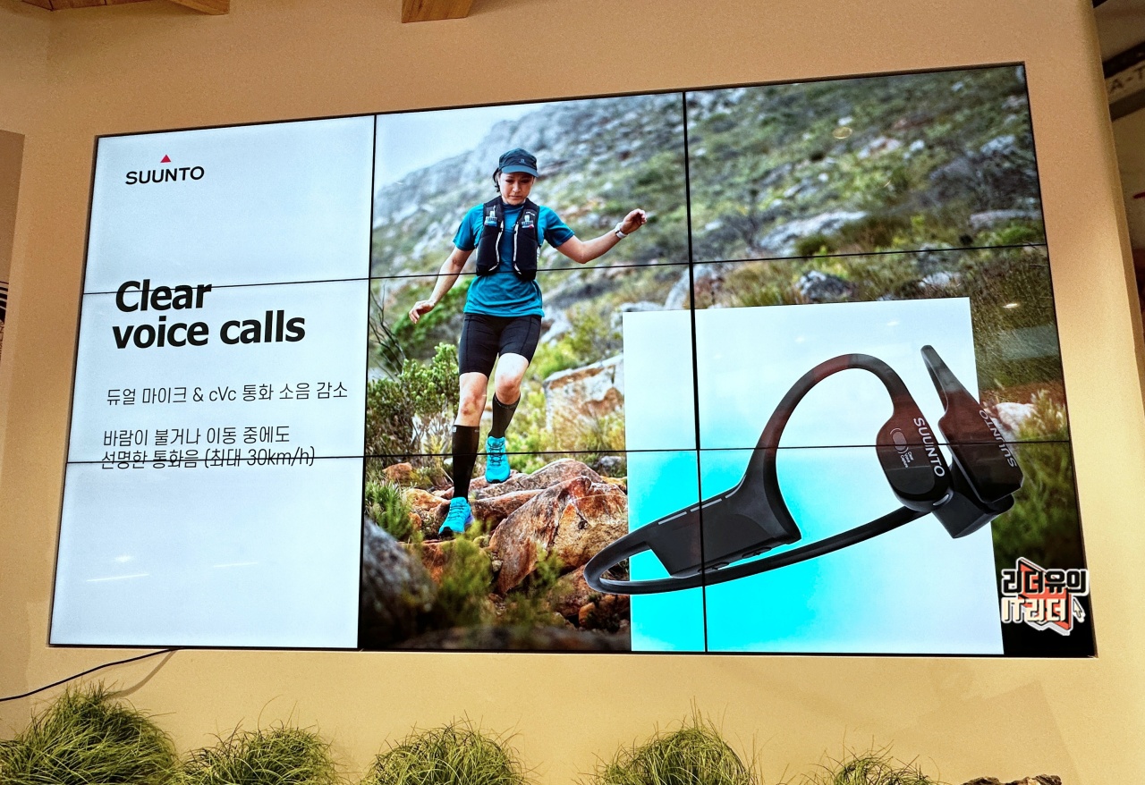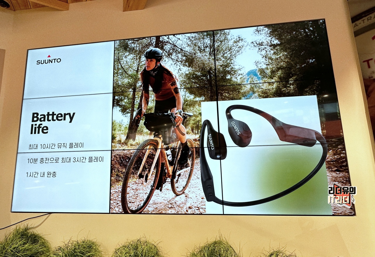 예를 들어 트레일러닝을 한다고 할때 산에서 뛰어 내려오는데 이어폰이 귀에서 빠지면 안되겠죠. 산속에서 이어폰 찾다가 시간 다 보낼 수 있습니다. 그리고 귀를 완전히 막는 방식은 다른 사람들의 소리를 못듣는다는 위험성을 가지고 있습니다. 길을 잘못들고 있어서 뒤에서 누군가 이야기 해줄때 소리가 안들리면 혼자 다른길을 가게 되는 것입니다. 그래서 순토는 이런 점을 고려해 골전도 이어폰 방식으로 순토만의 새로움을 보여주고 있습니다.