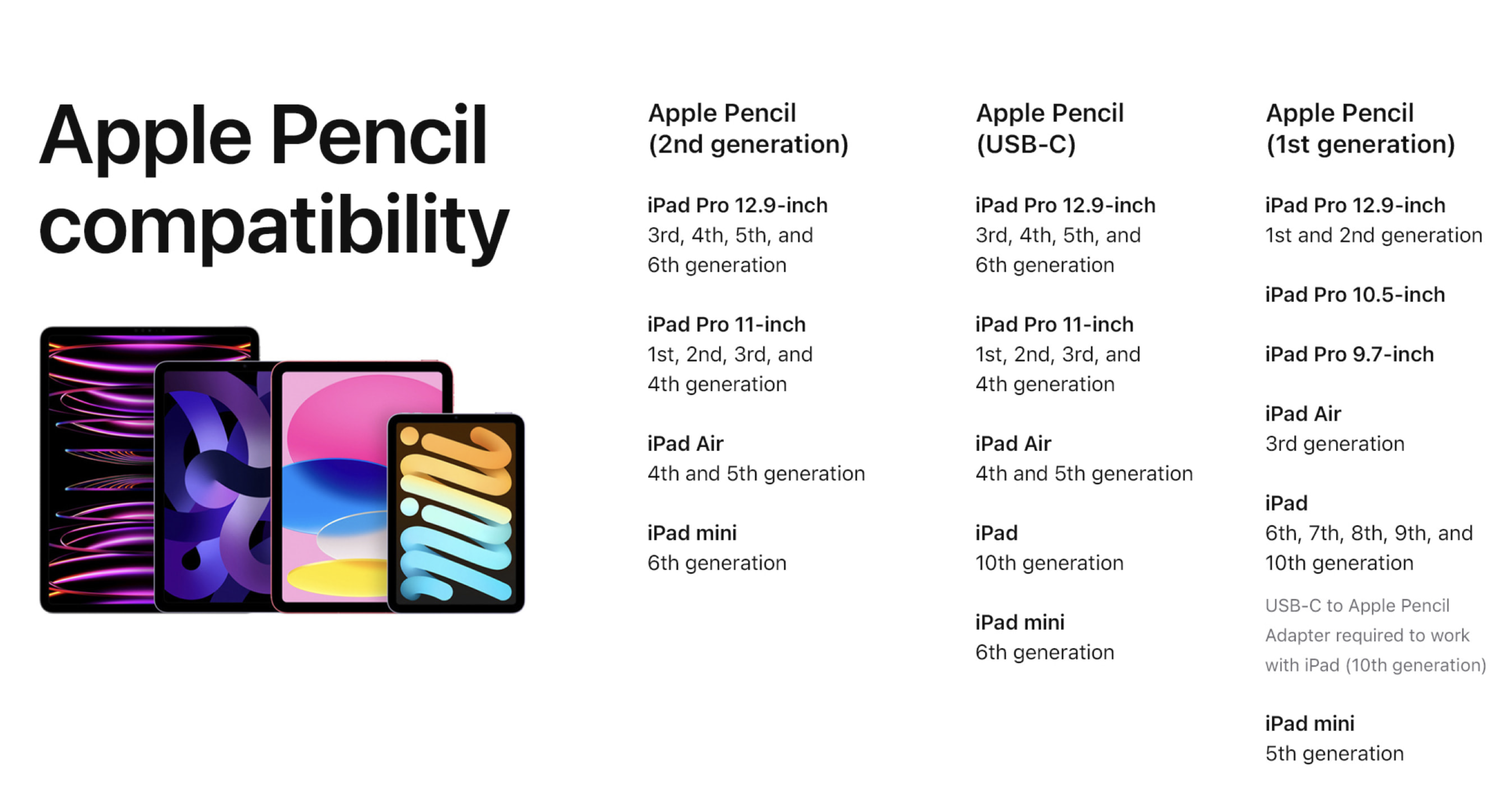 애플펜슬 USB-C는 애플펜슬 1세대를 지원하는 아이패드10을 비롯해 애플펜슬 2세대를 지원하는 아이패드 에어 4세대, 5세대 아이패드 프로11 1세대~4세대, 아이패드 프로 12.9 3세대~ 6세대, 아이패드 미니 6세대를 비롯 USB-C 포트를 갖춘 모든 아이패드와 호환이 됩니다.