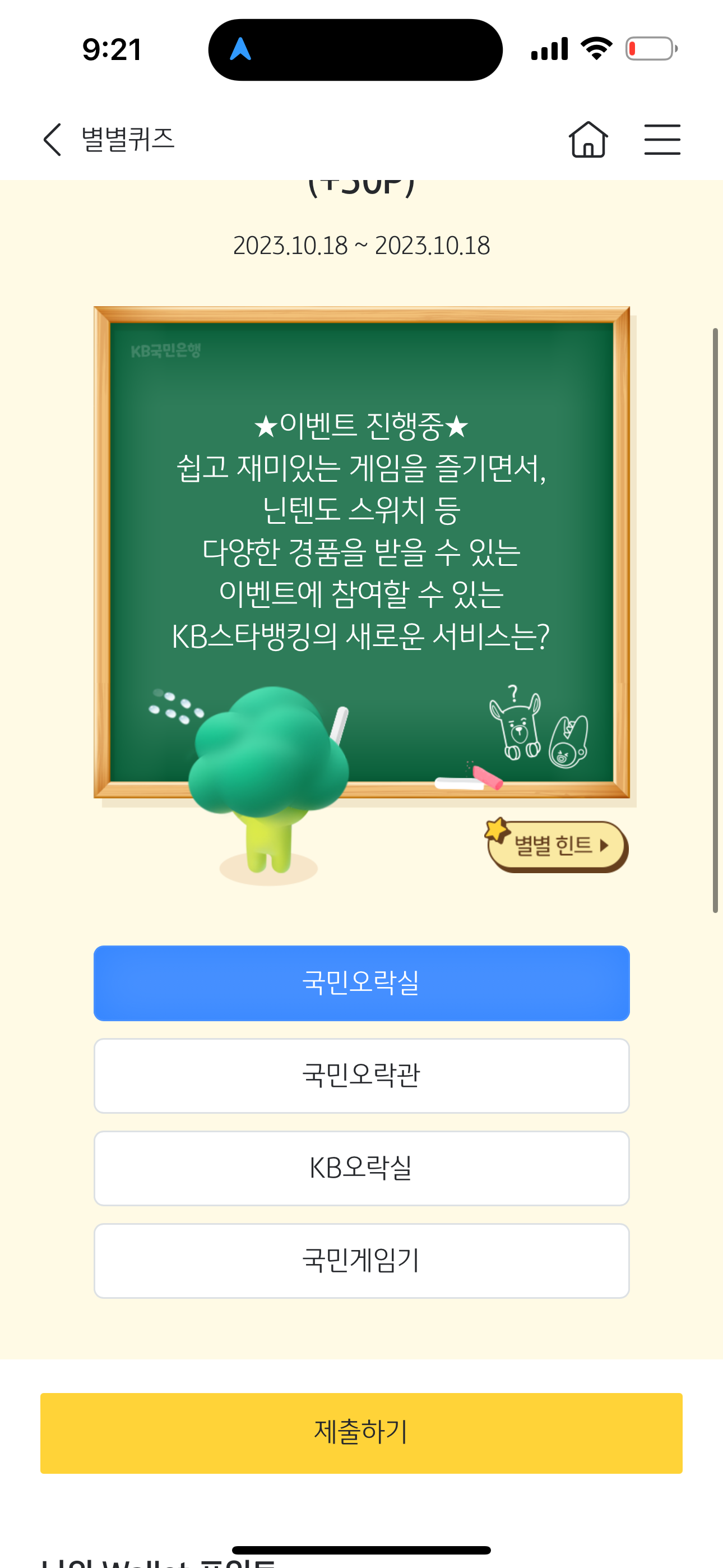 KB스타뱅킹 별별퀴즈 정답은 국민오락실 입니다