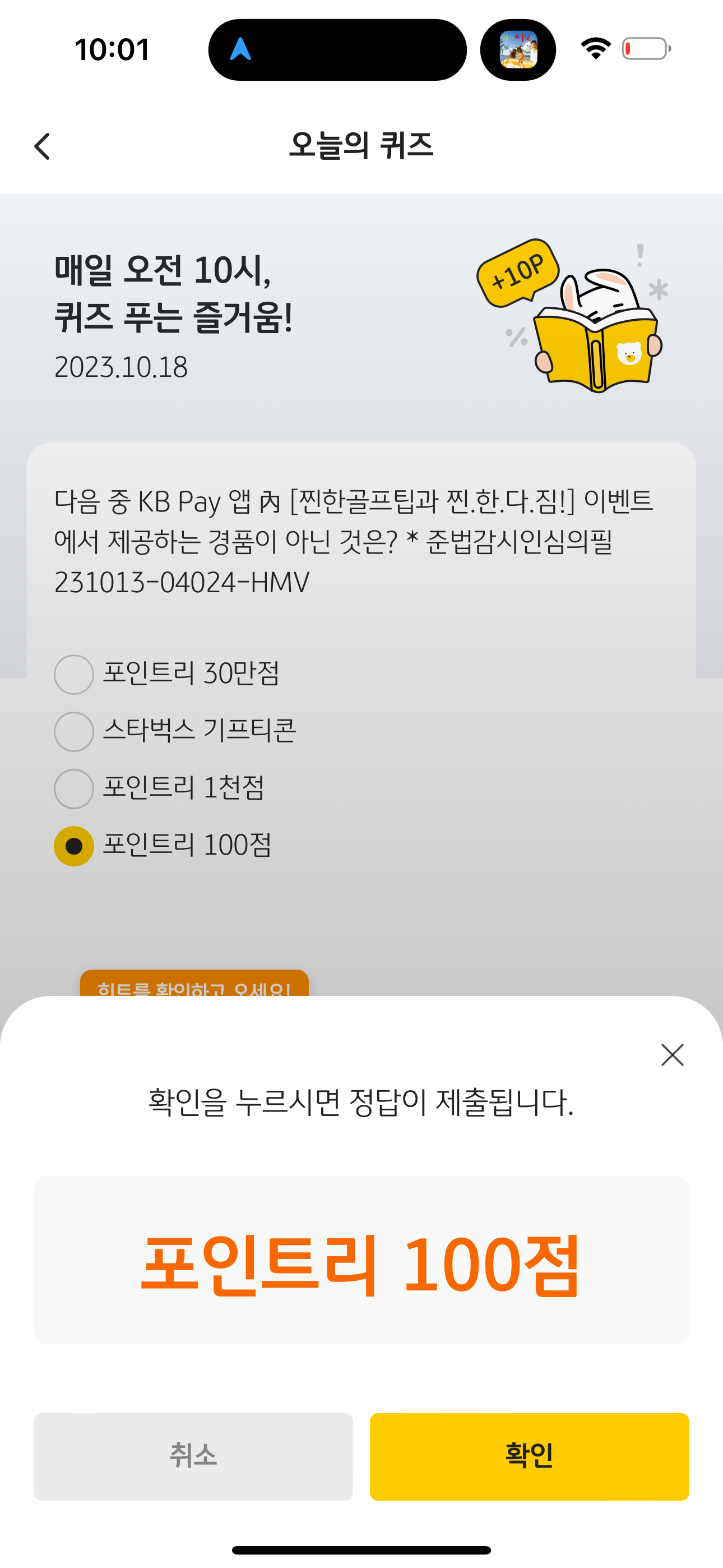 KB Pay 오늘의 퀴즈 정답은 포인트리 100점 입니다