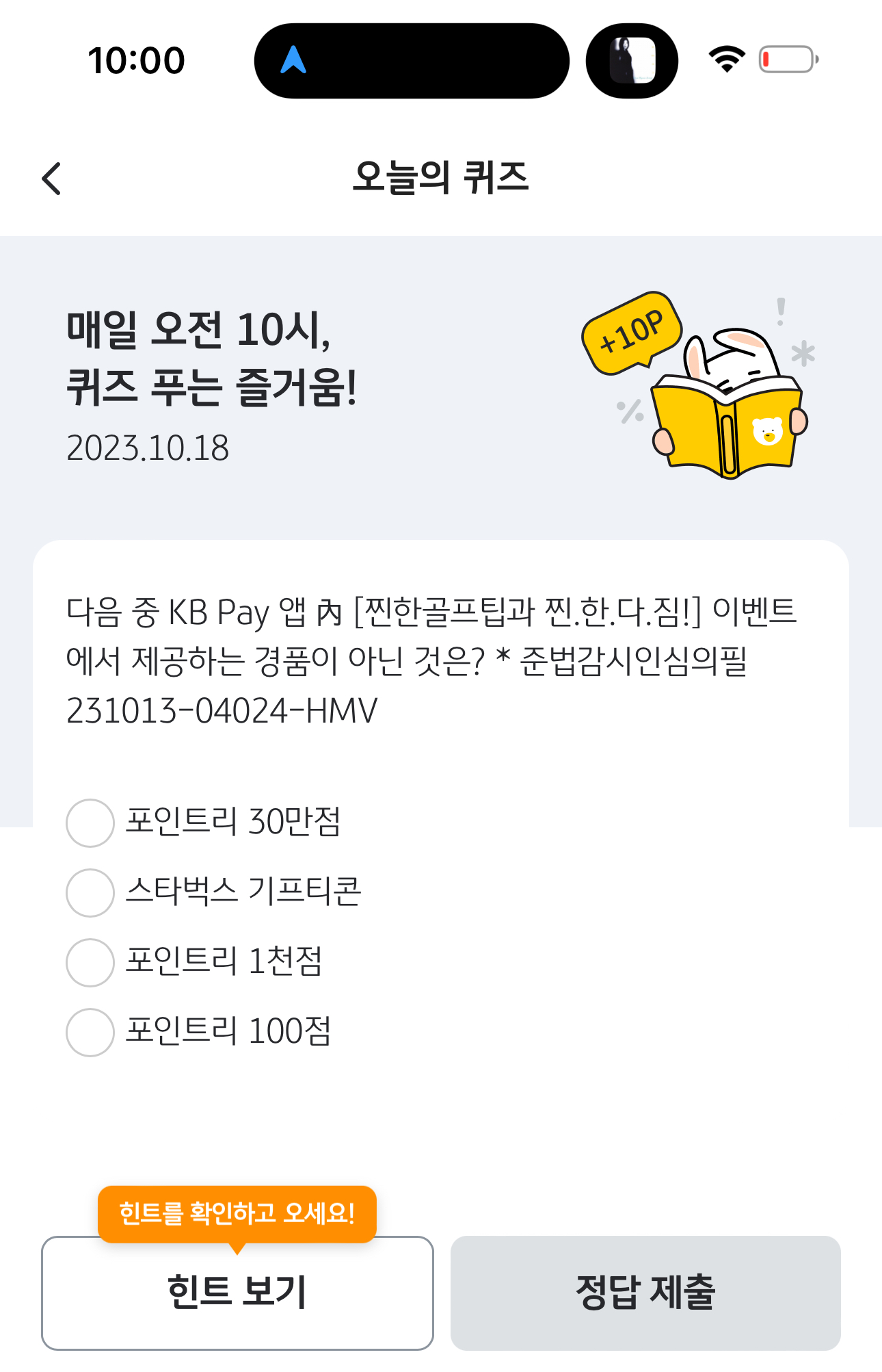 다음 중 KB Pay 앱 內 [찐한골프팁과 찐.한.다.짐!] 이벤트에서 제공하는 경품이 아닌 것은? * 준법감시인심의필 231013-04024-HMV 보기는 1. 포인트리 30만점 2. 스타벅스 기프티콘 3. 포인트리 1천점 4. 포인트리 100점 입니다.