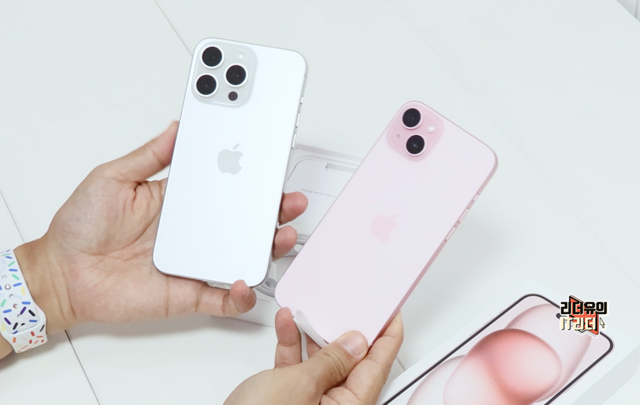 아이폰15 프로 맥스와 아이폰15 플러스를 비교한 모습입니다. 색상 경쟁력은 아이폰15 플러스가 확실히 좋습니다.