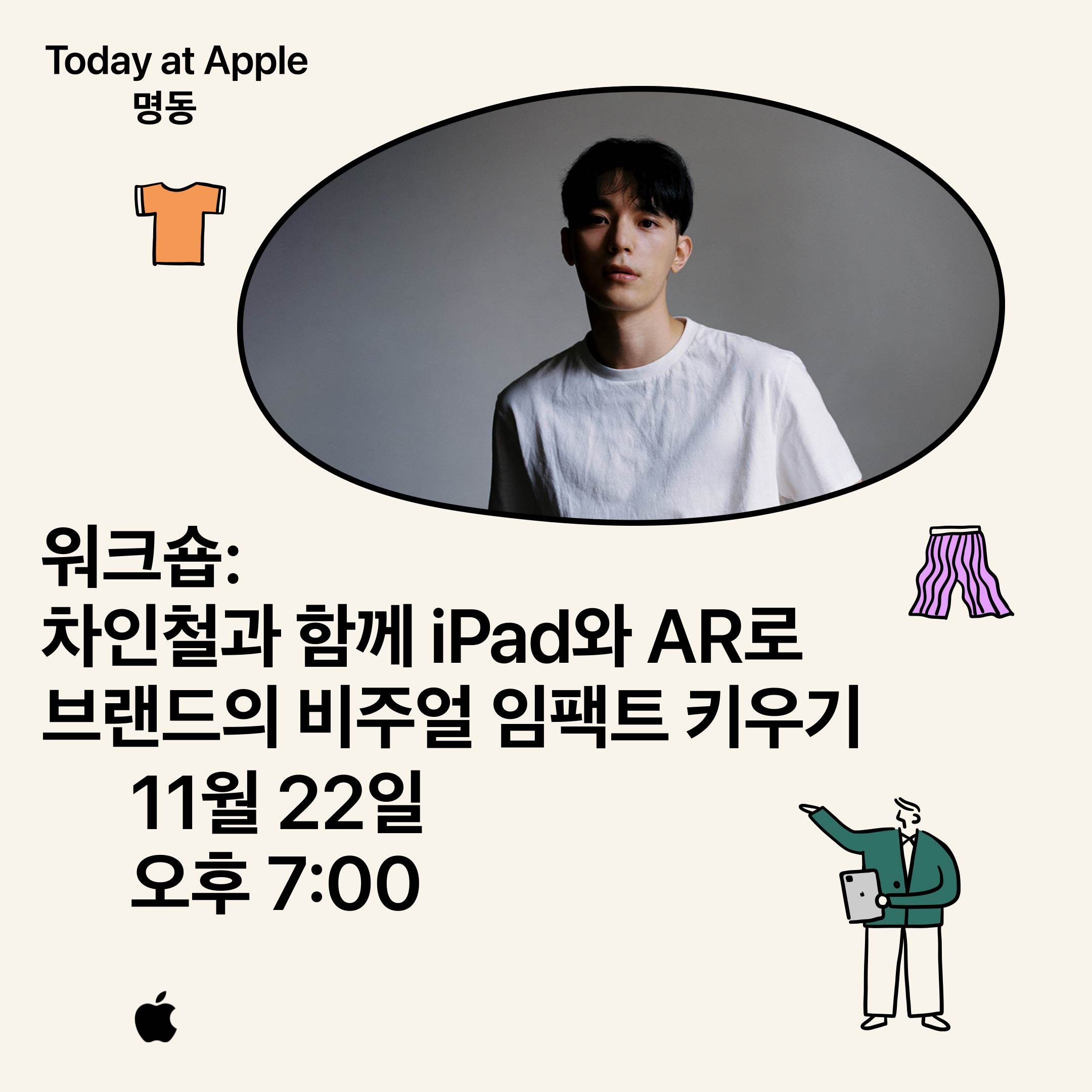 그래픽디자이너이자 일러스트레이터, 아트디렉터인 차인철의 노하우를 배워 아이패드의 프로크리에이트(Procreate) 앱으로 브랜드 정체성이 담긴 심볼을 디자인한 후 실감 나는 AR콘텐츠로 구현하는 것을 배울 수 있다고 합니다. 11월 22일(수) 오후 7:00~8:30 애플 명동 (명동 애플스토어)에서 진행됩니다.