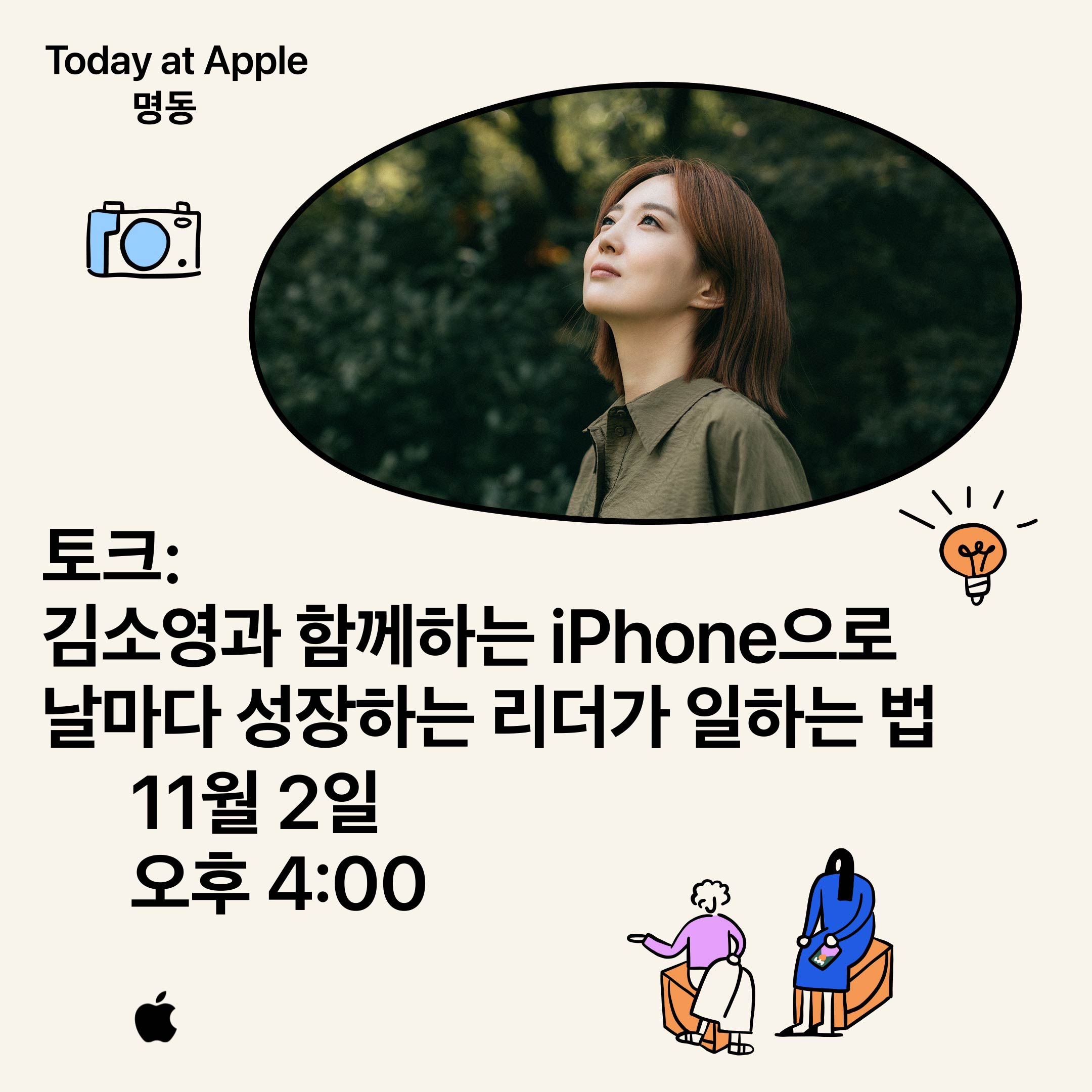 김소영님은 MBC 아나운서 출신의 방송인이자 사업가로 비즈니스 성장 스토리를 듣고 아이폰을 활용한 쉽고 효과적인 생산성 팁을 전수한다고 합니다. 11월 2일(목) 오후 4:00~5:00 까지이며 애플 명동 (명동 애플스토어)에서 진행됩니다.