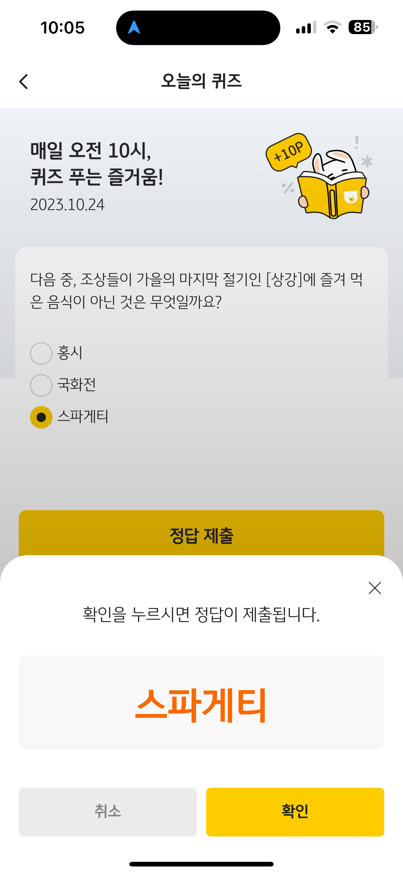 KB Pay 오늘의 퀴즈 정답은 스파게티 입니다