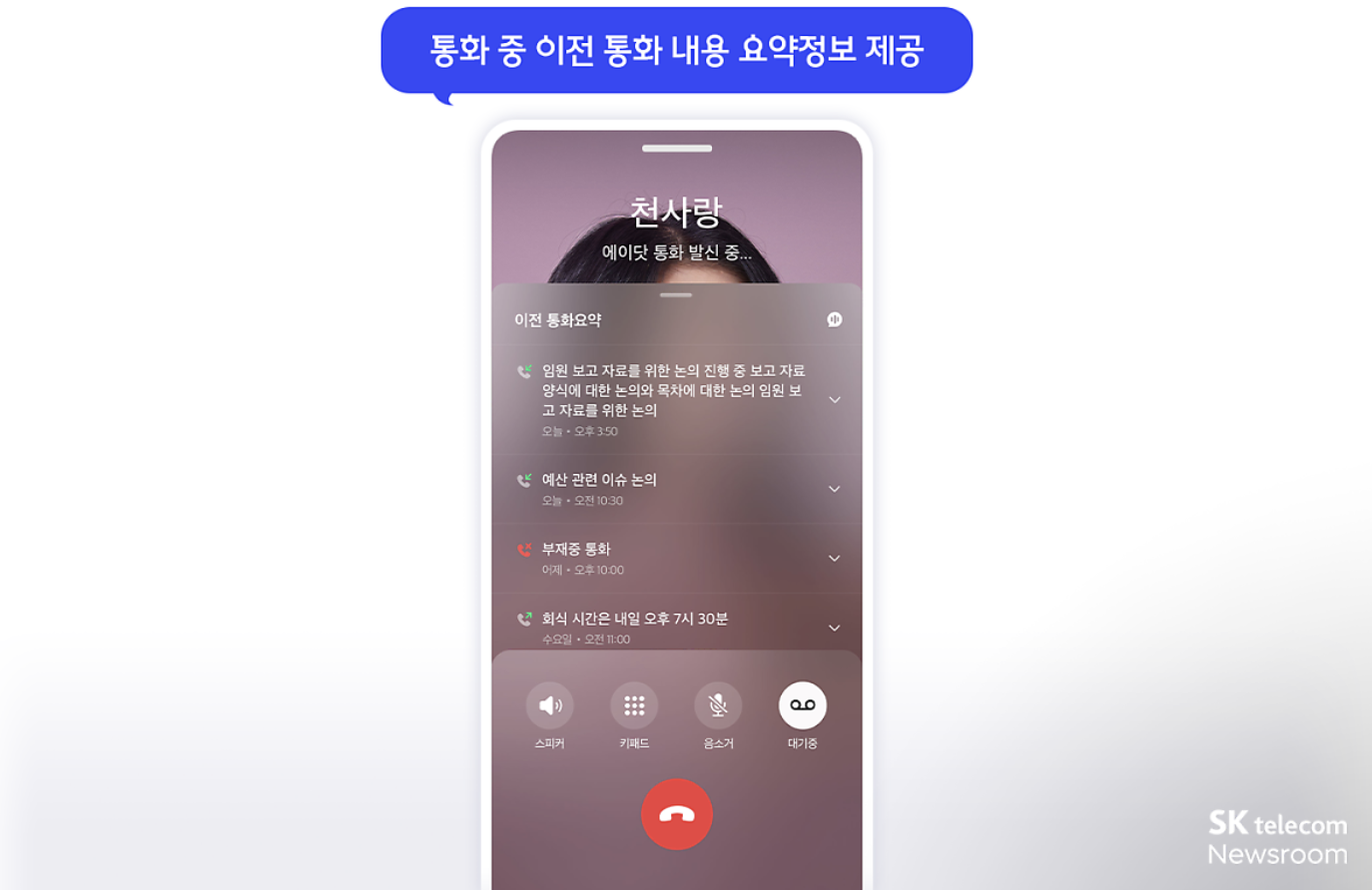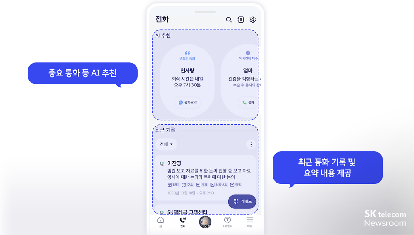 A.전화(에이닷 전화)는 화면 상단에는 AI 추천 내용을 볼 수 있고 하단에는 최근 통화 기록 및 요약 내용을 볼 수 있게 되어 있습니다.