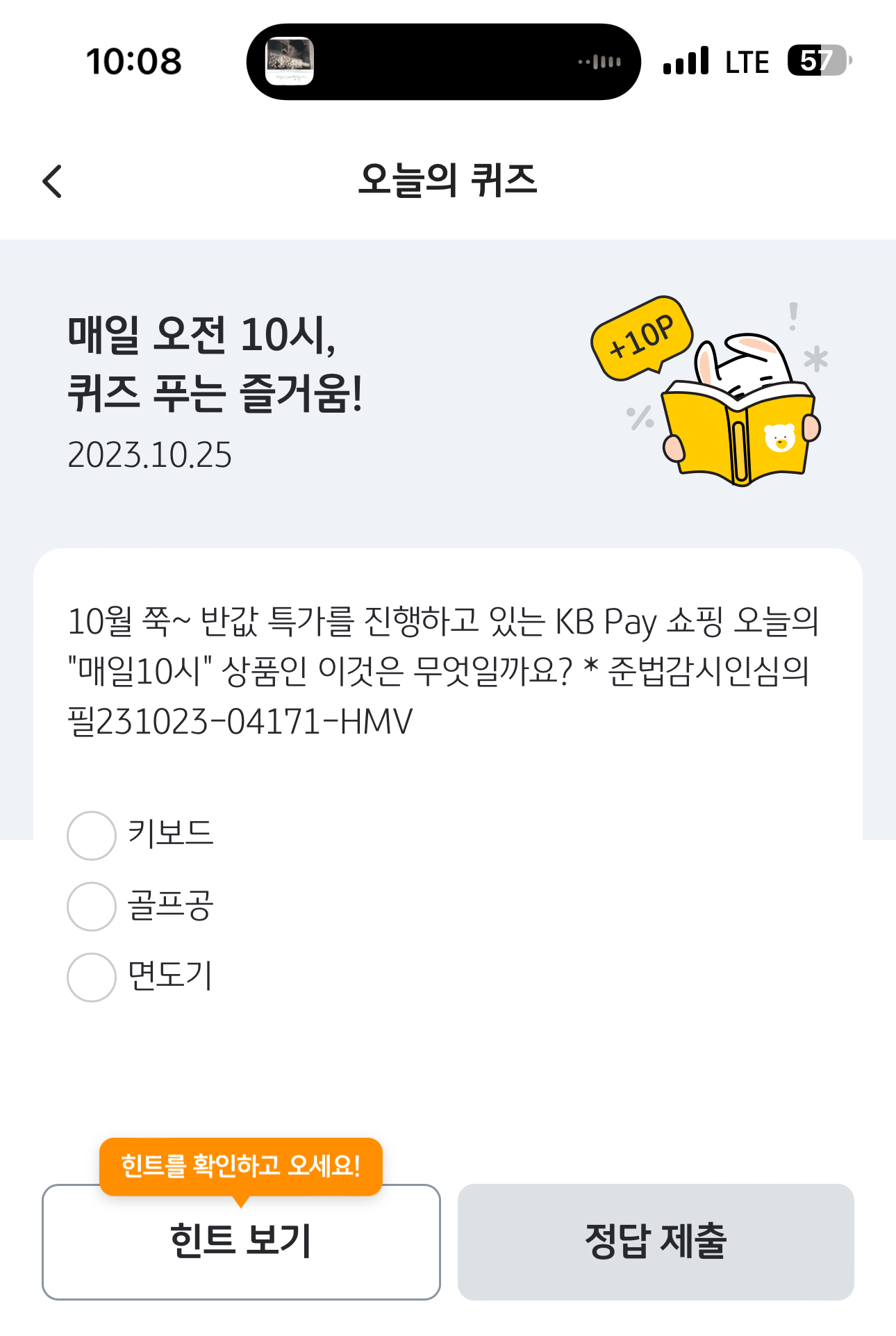 KB Pay 오늘의 퀴즈 정답은 골프공 입니다