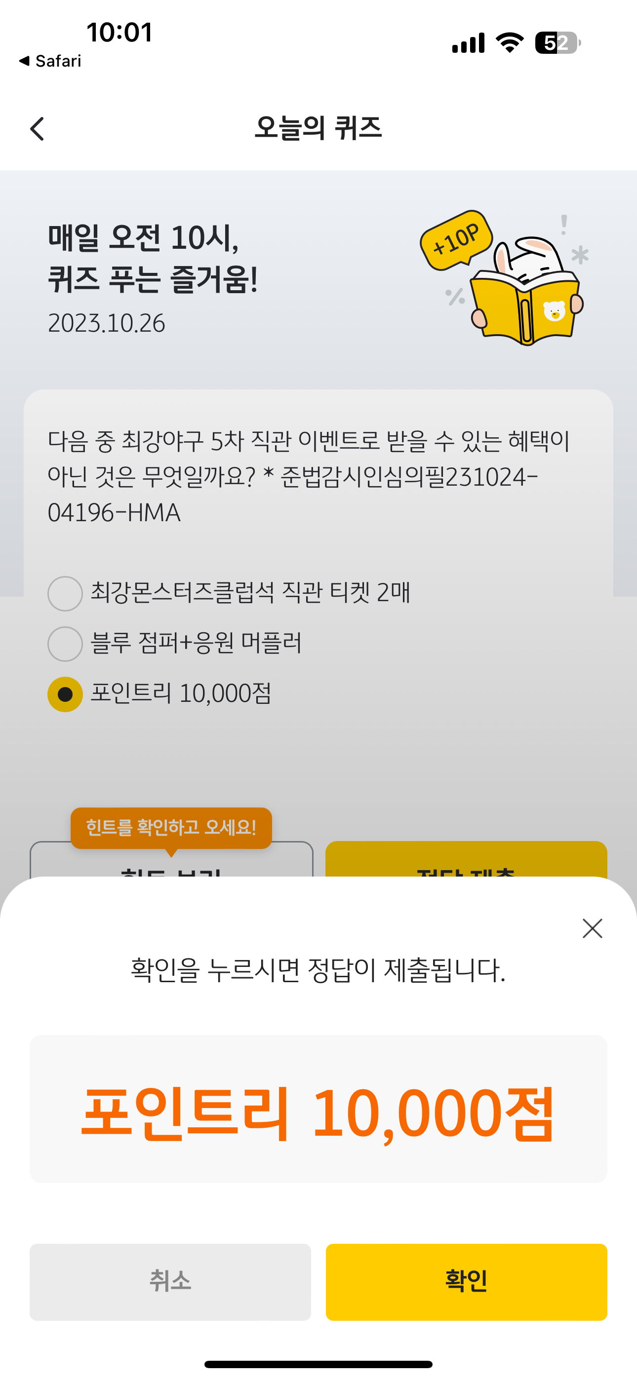 KB Pay 오늘의 퀴즈 10월 26일 정답(다음 중 최강야구 5차 직관 이벤트로 받을 수 있는 혜택이 아닌 것은 무엇일까요)