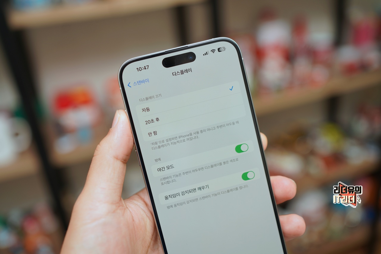 아이폰 iOS17.1 에서는 스탠바이 기능에 디스플레이 끄는 시간 설정이 들어갔습니다. iPhone 14 Pro, iPhone 14 Pro Max, iPhone 15 Pro, iPhone 15 Pro Max의 경우는 상시표시형 디스플레이라 스탠바이 기능시 화면이 안꺼지게 사용이 가능한데요. 화면이 꺼지길 원하는 사용자들도 있으니 이걸 옵션으로 넣었습니다. 디스플레이 끄기 옵션은 자동, 20초 후, 안 함 설정이 가능하고 자동의 경우는 아이폰을 사용중이 아니고 주변이 어두울 때 디스플레이가 지능적으로 꺼지게 됩니다.