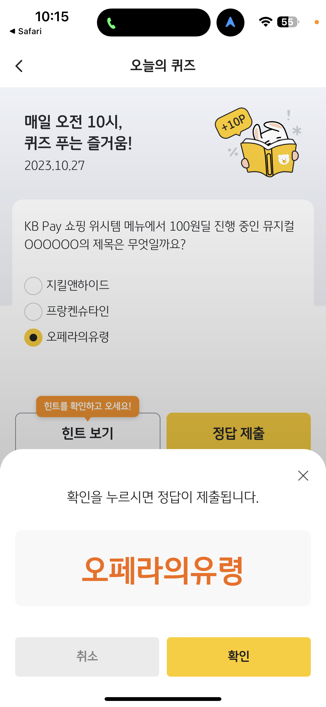 KB Pay 오늘의 퀴즈 정답은 오페라의유령 입니다