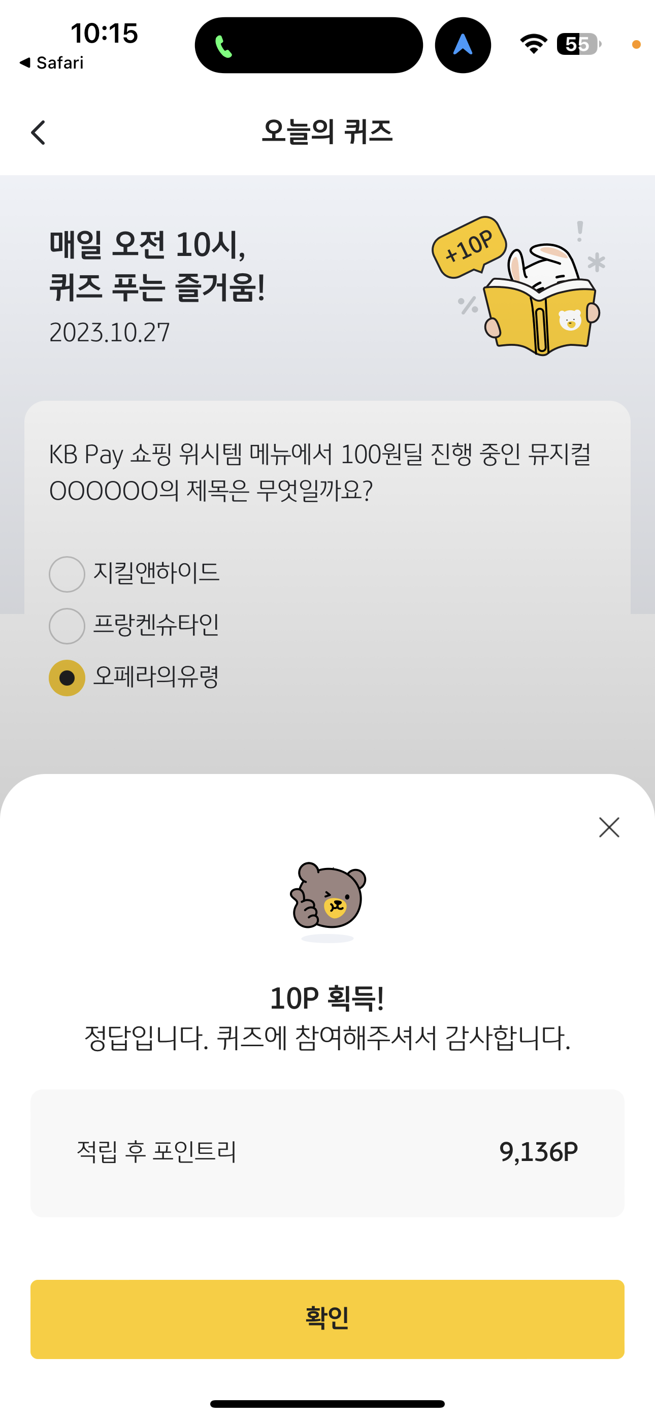 KB Pay 오늘의 퀴즈 정답은 오페라의유령 입니다