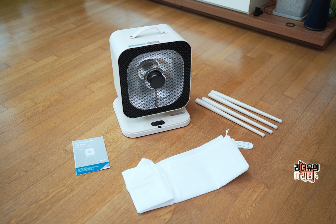 에코제트 하이라이트 전기히터 구성품은 본체, 다리, 리모컨, 파우치로 구성되어 있습니다. 별도의 다리가 있다는게 신기한데요. 감성 히터의 모습을 보여줄 개성있는 포인트 입니다.