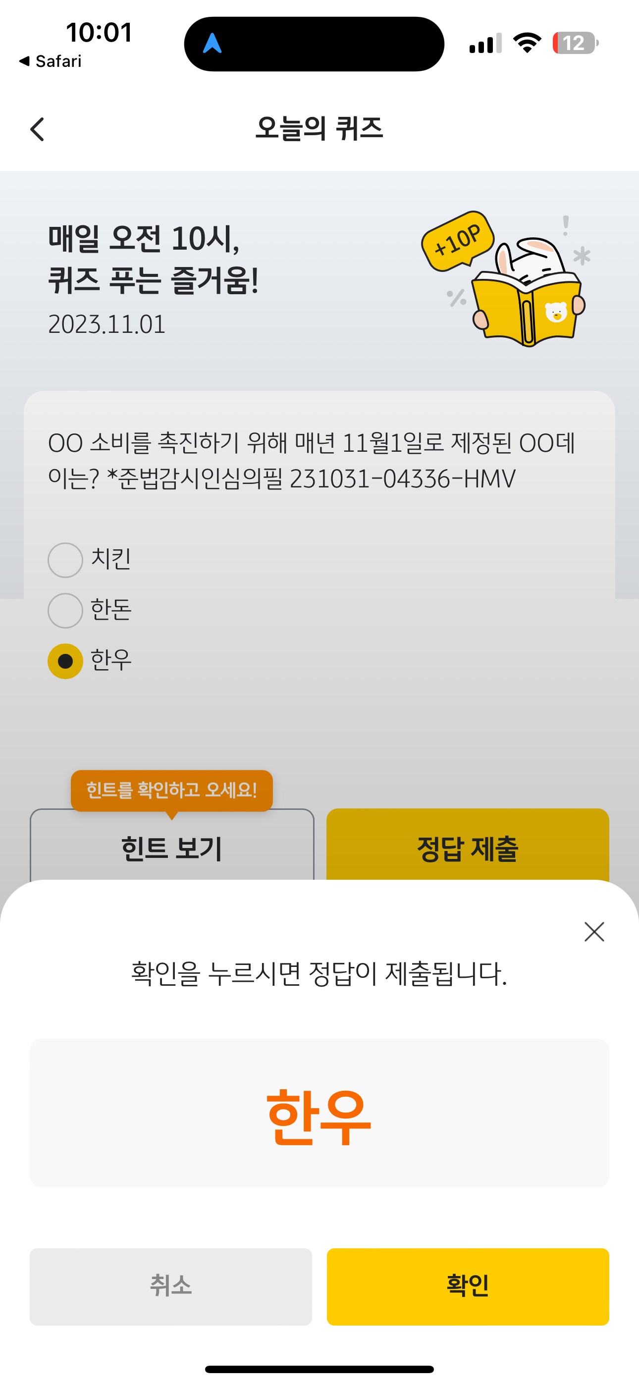 KB Pay 오늘의 퀴즈 정답은 한우 입니다