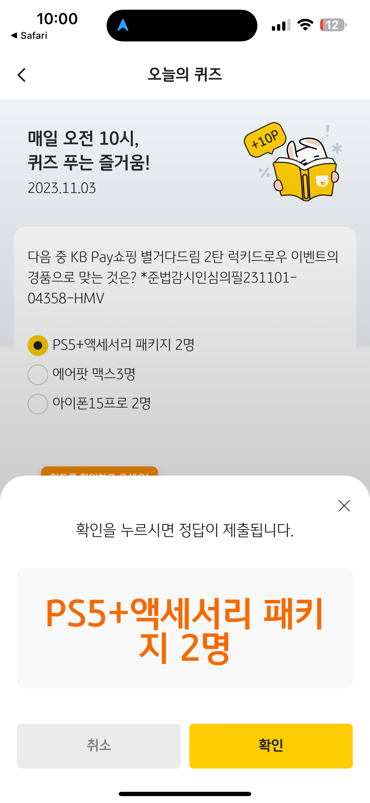 KB Pay 오늘의 퀴즈 정답은 PS5+액세서리 패키지 2명 입니다