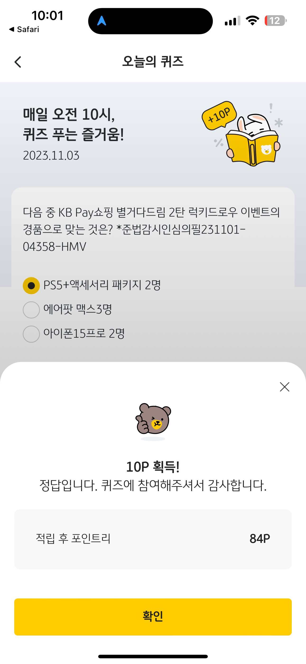 KB Pay 오늘의 퀴즈 정답은 PS5+액세서리 패키지 2명 입니다