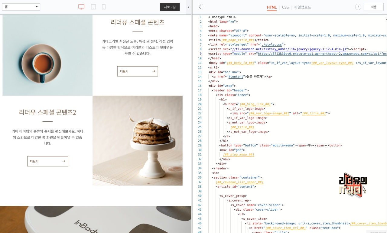 티스토리 내에 있는 스킨편집으로 들어가서 html 편집을 선택해 들어갑니다.