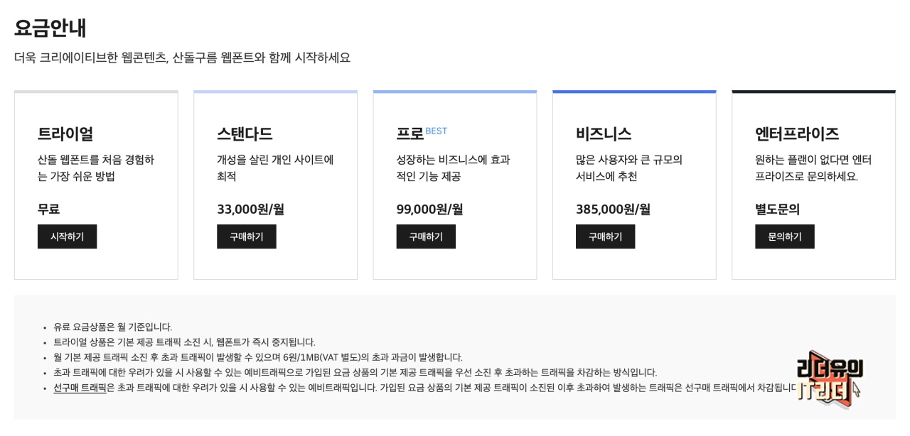 웹폰트는 당연히 서비스를 이용하는 방식이니 비용이 발생됩니다. 산돌구름 웹폰트 서비스는 합리적인 비용을 책정해 부담을 낮췄는데요. 월간/연간 구독방식을 선택할 수 있고 기본 제공 트래픽에 따라 스탠다드, 프로, 비즈니스, 엔터프라이즈 선택이 가능합니다. 운영하는 사이트 규모에 따라 선택할 수 있어 비용적인 부담을 많이 낮출 수 있습니다. 그리고 어떤 요금제를 선택할 지 모르겠다면 무료 트라이얼을 사용해 보고 본인에게 맞는 요금제를 선택하는 것을 추천합니다.