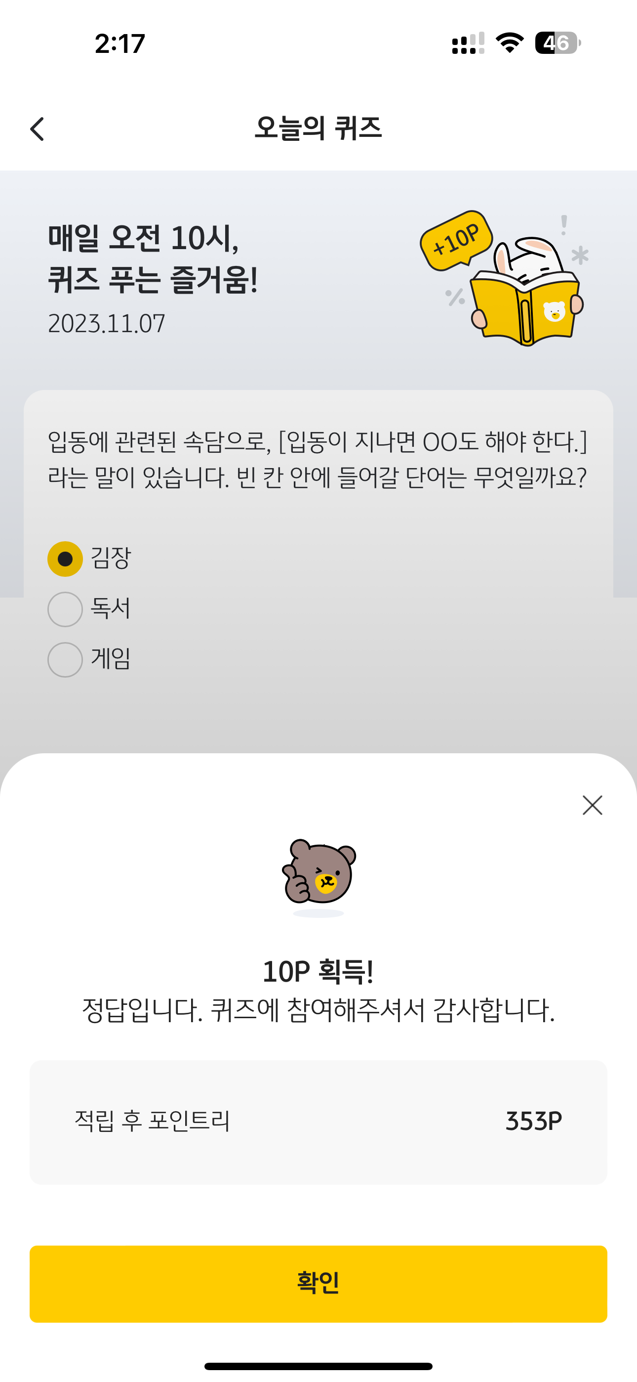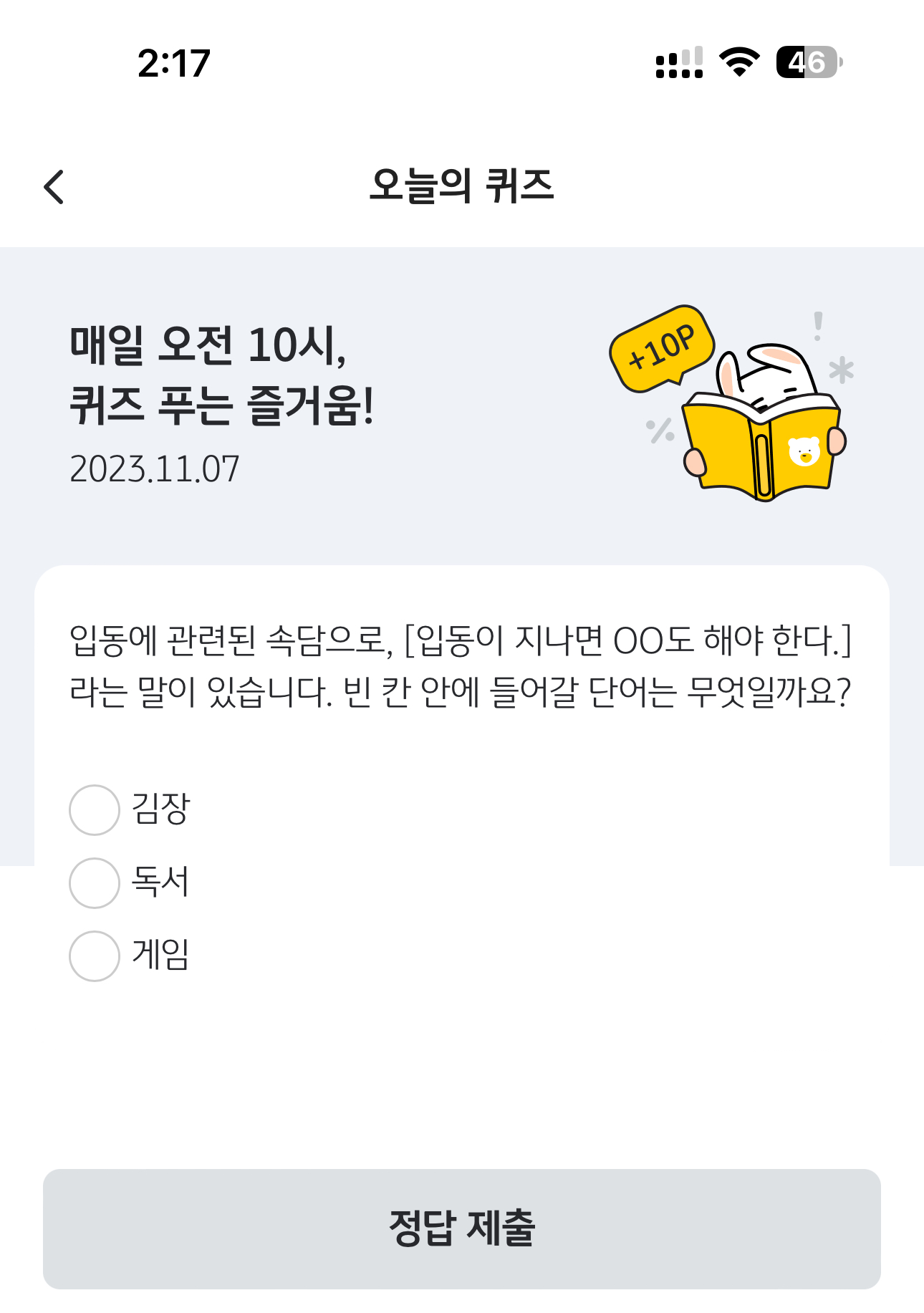 KB Pay 오늘의 퀴즈 11월 7일 정답은 김장 입니다