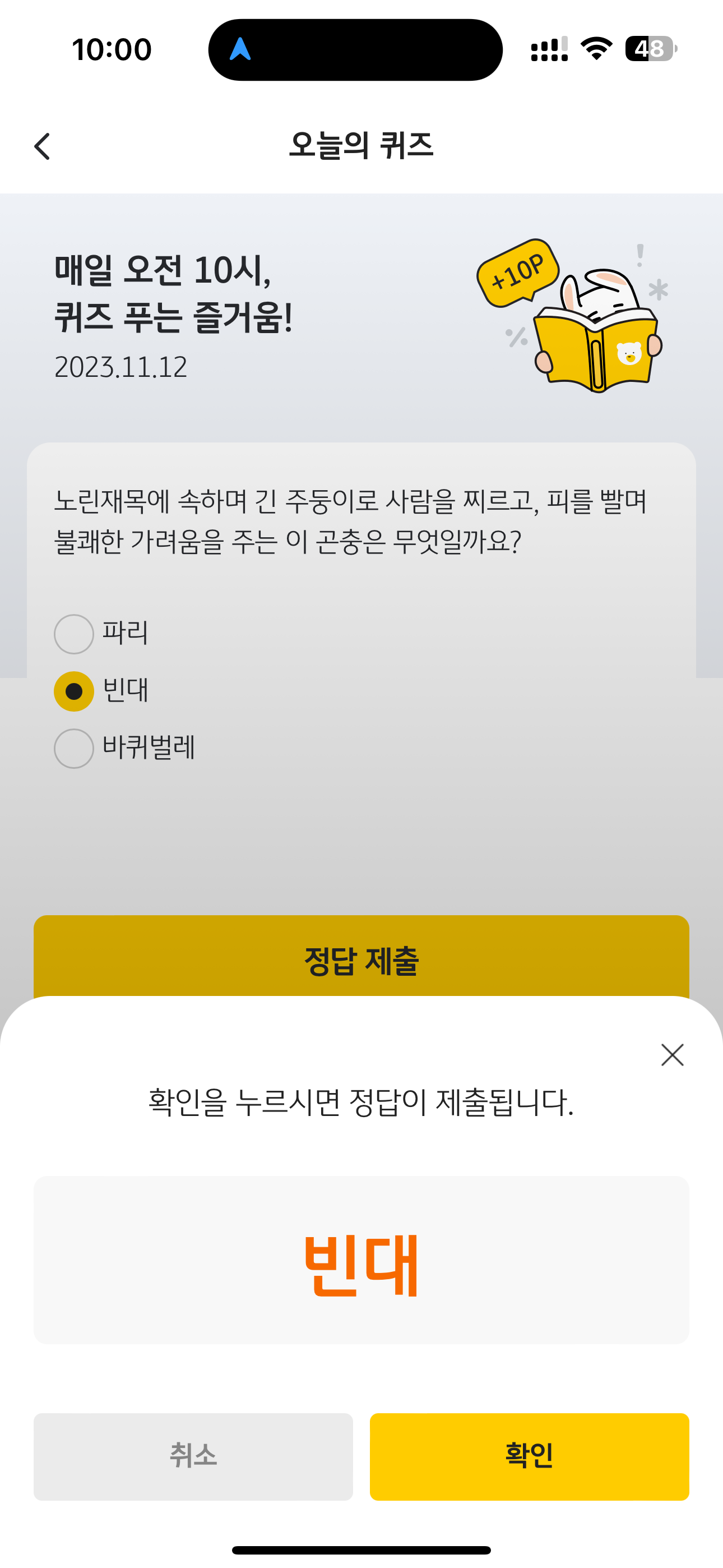 KB Pay 오늘의 퀴즈 정답은 빈대 입니다