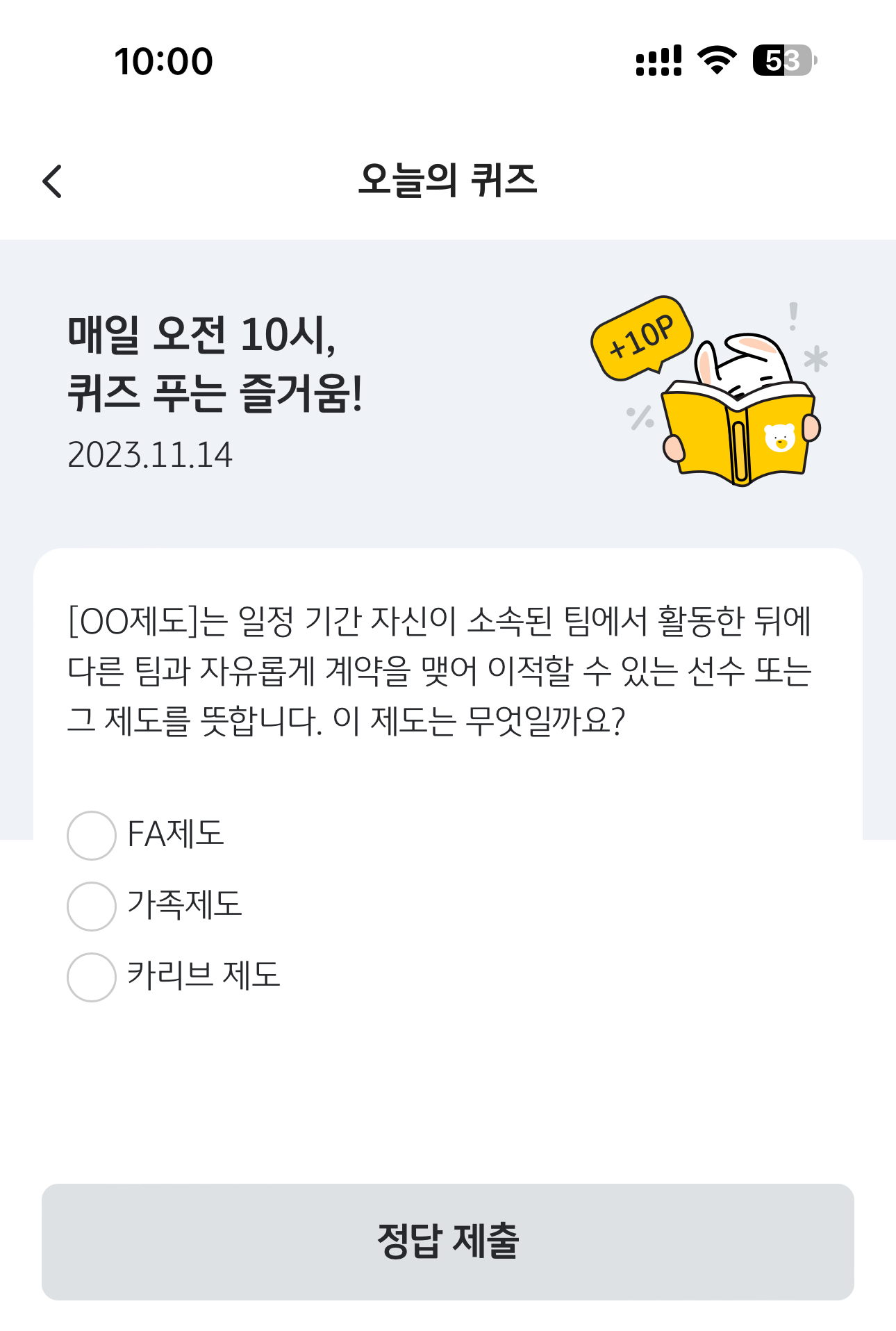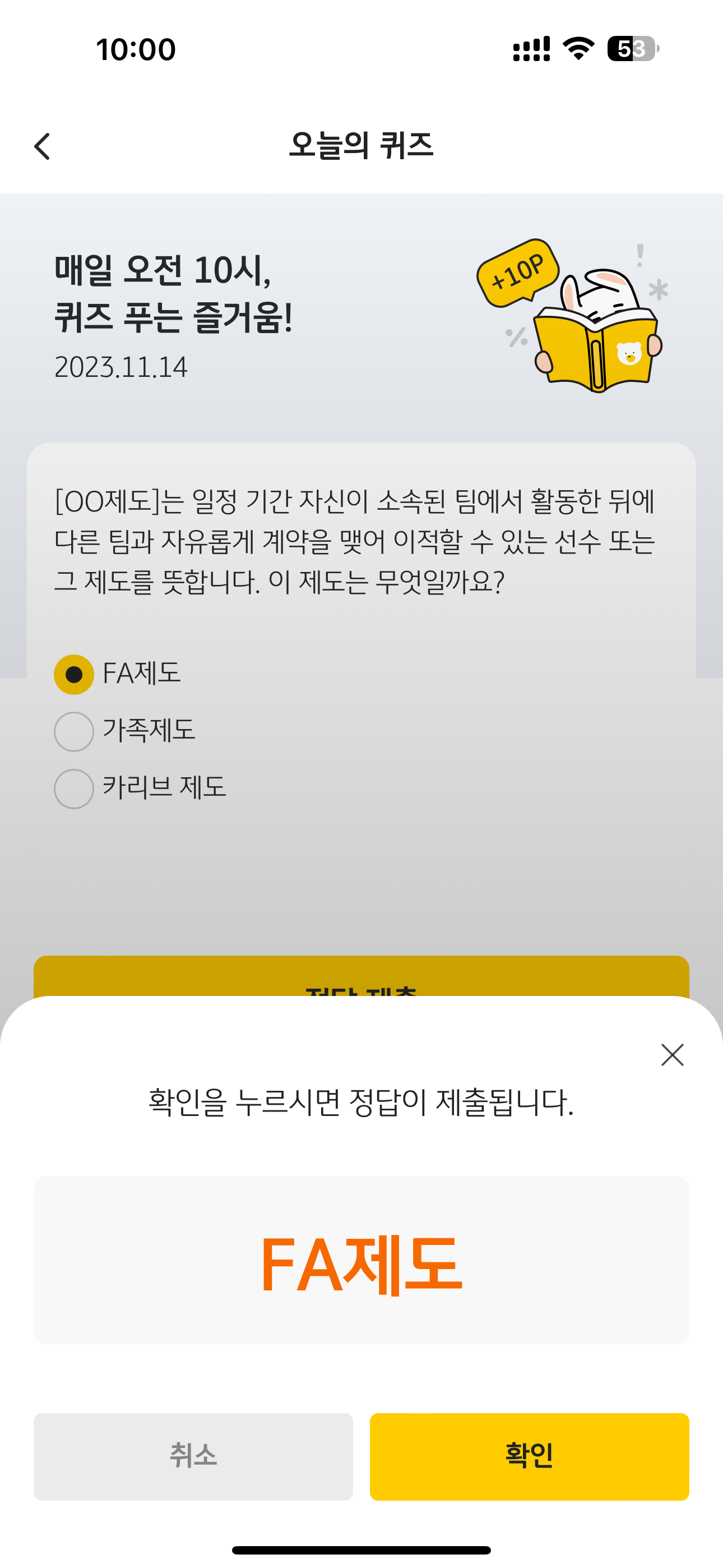 KB Pay 오늘의 퀴즈 정답은 FA제도 입니다