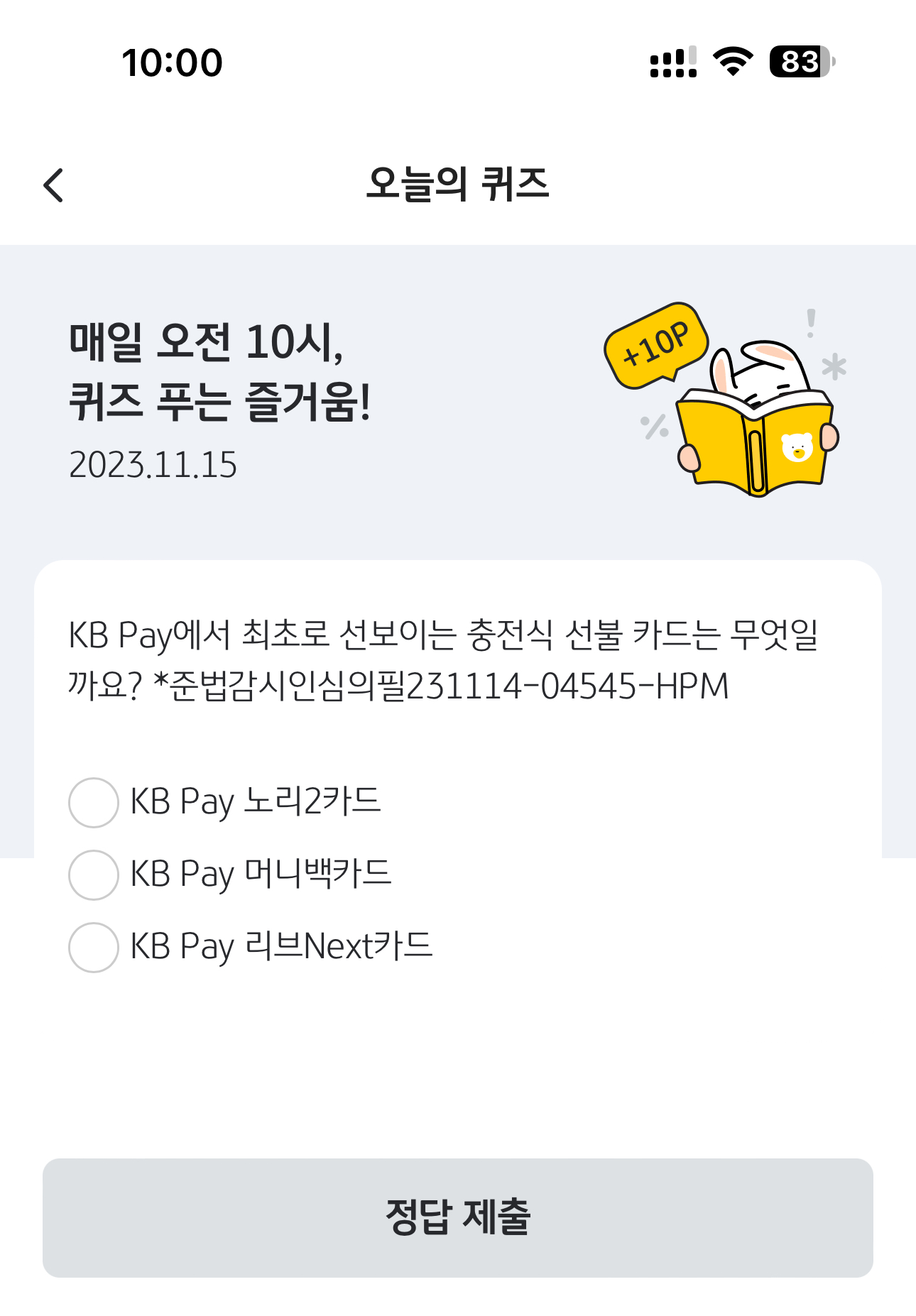 KB Pay 오늘의 퀴즈 정답은 KB Pay 머니백카드 입니다