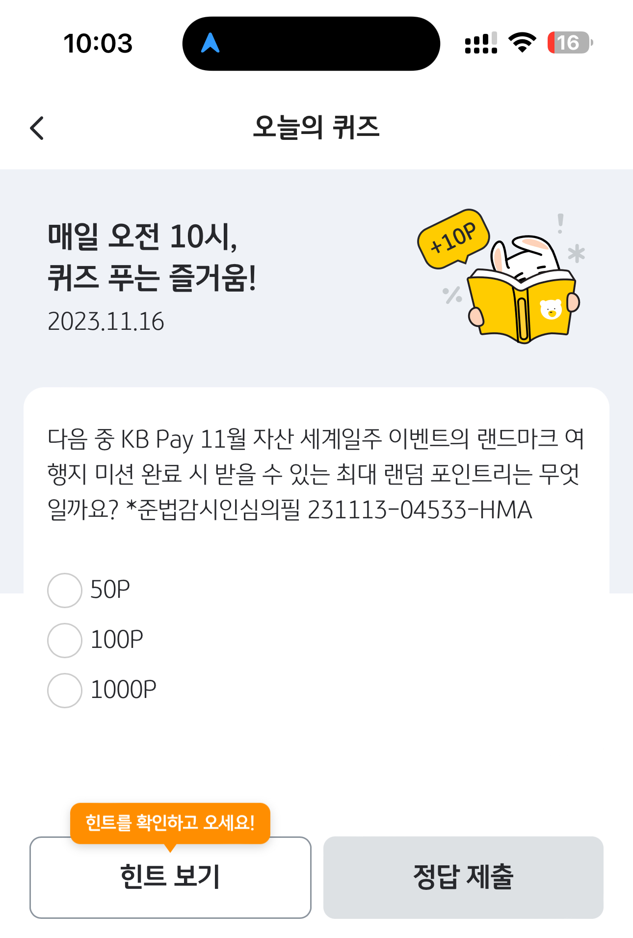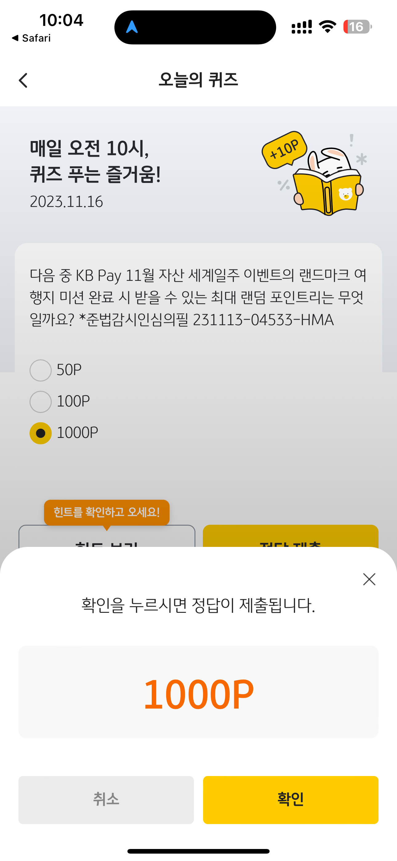 KB Pay 오늘의 퀴즈 정답은 1000P 입니다