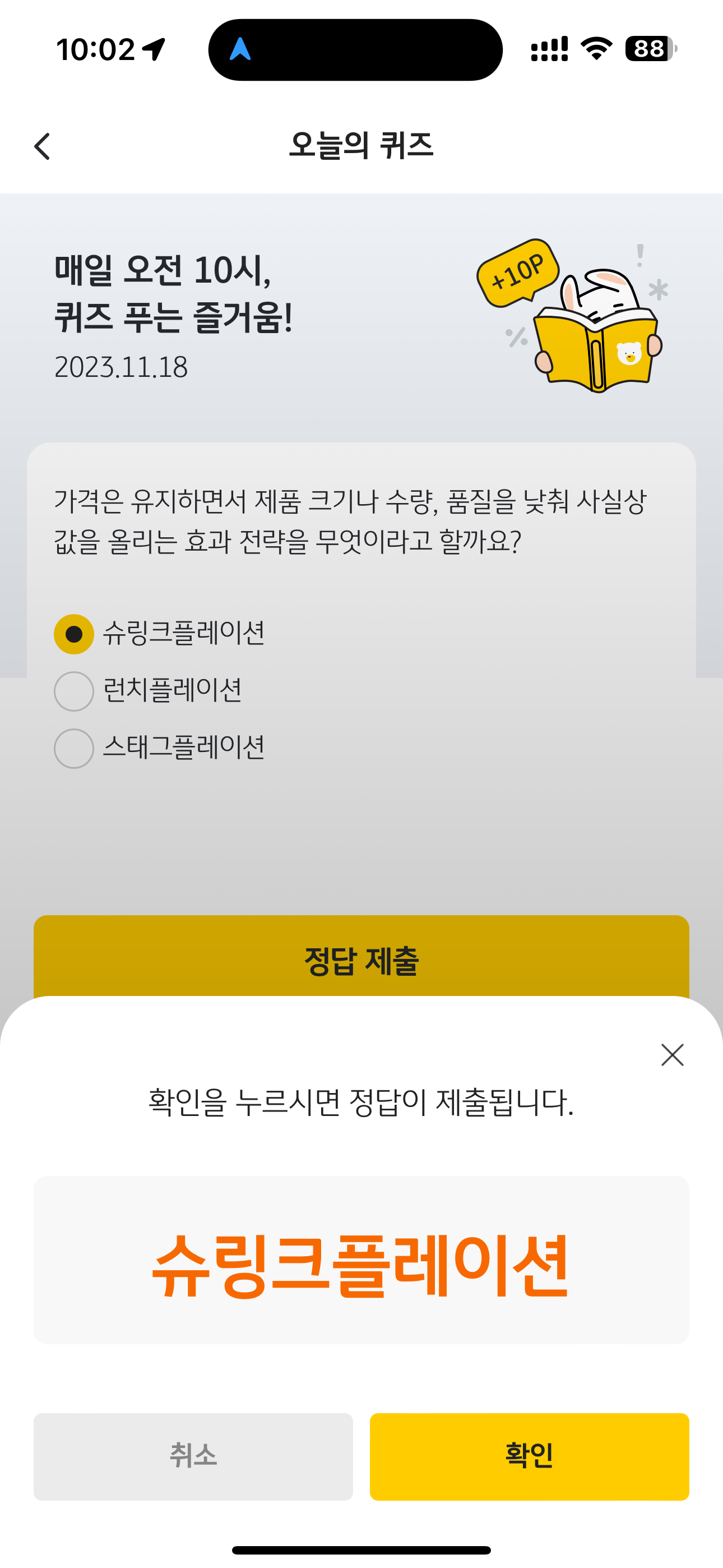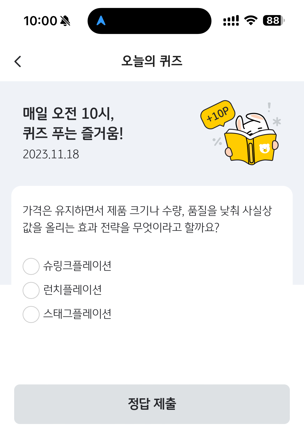 KB Pay 오늘의 퀴즈 11월 18일 정답 (가격은 유지하면서 제품 크기나 수량, 품질을 낮춰 사실상 값을 올리는 효과 전략)