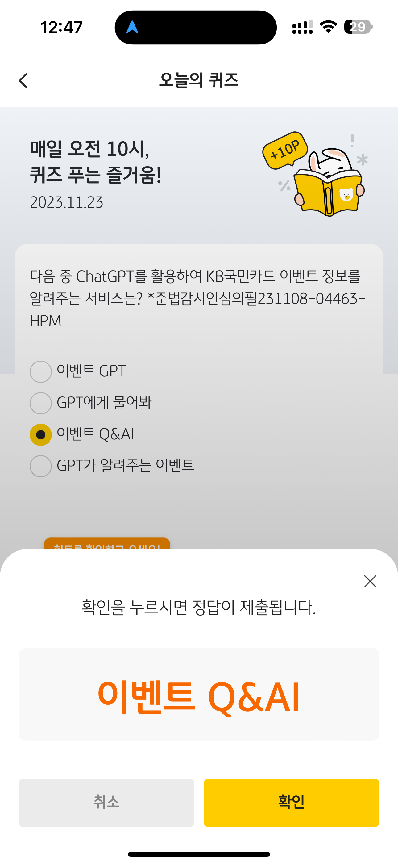 KB Pay 오늘의 퀴즈 11월 23일 정답(다음 중 ChatGPT를 활용하여 KB국민카드 이벤트 정보를 알려주는 서비스는?)