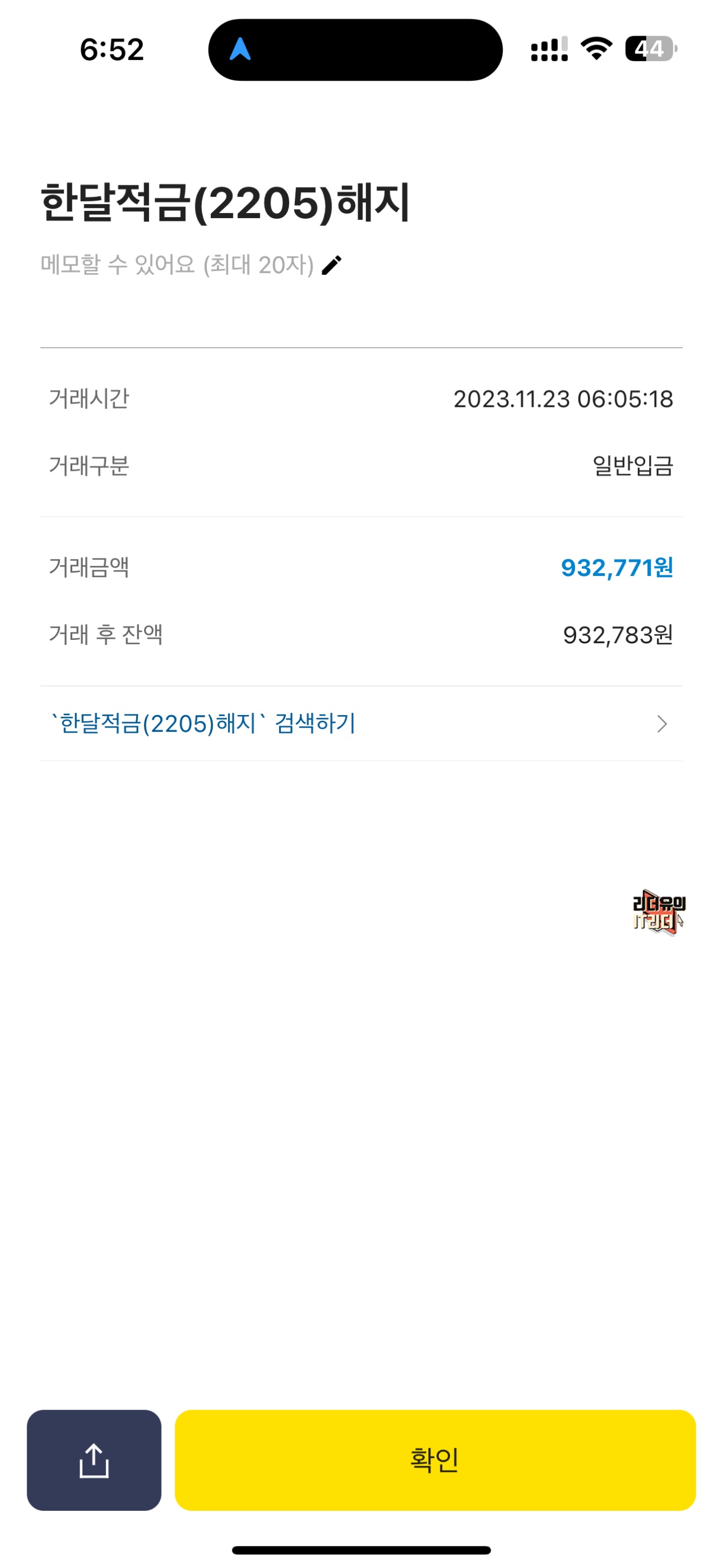 카카오뱅크 한달적금 만기때 들어온 돈은 932,771원 입니다. 원금 93만원을 빼면 전체 이자 금액은 2,771원이 됩니다.