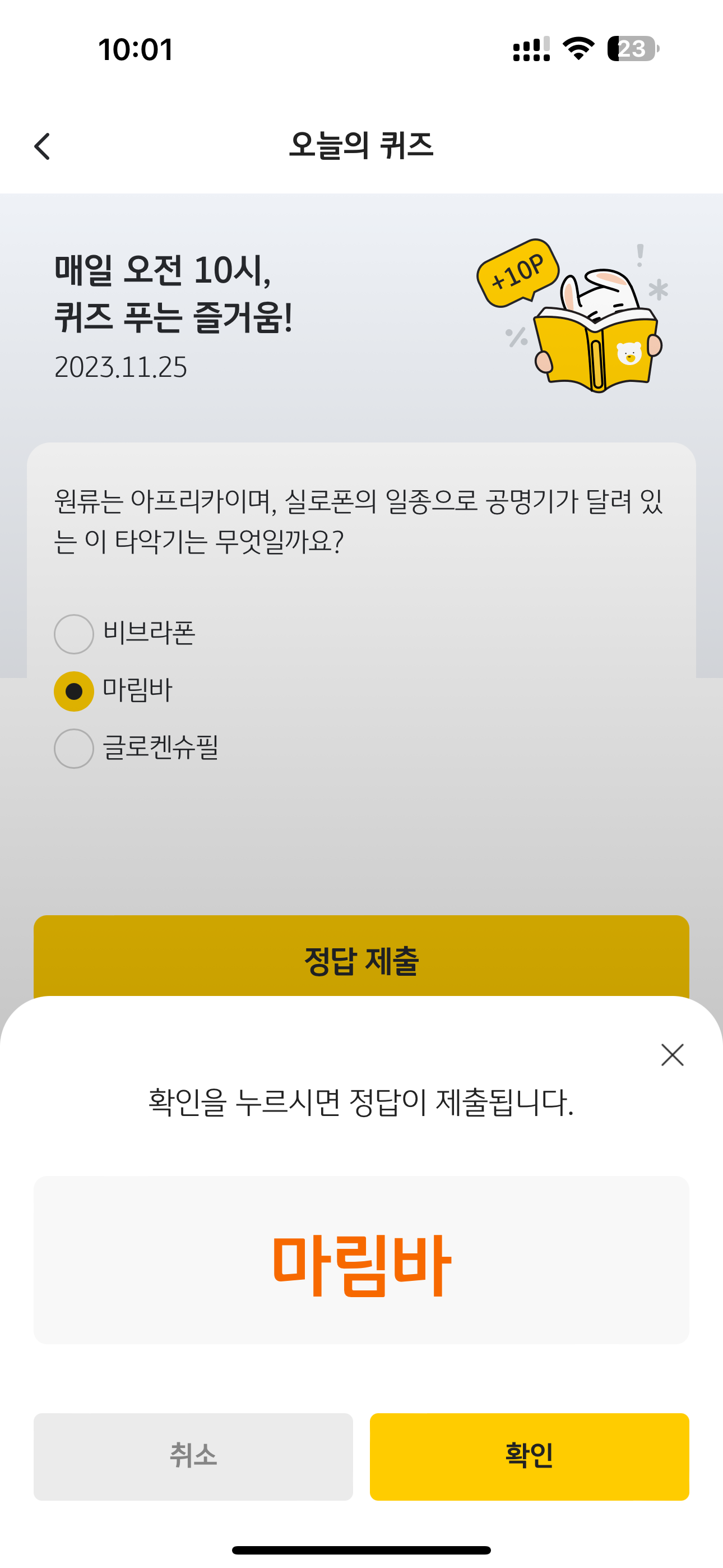 KB Pay 오늘의 퀴즈 정답은 마림바 입니다