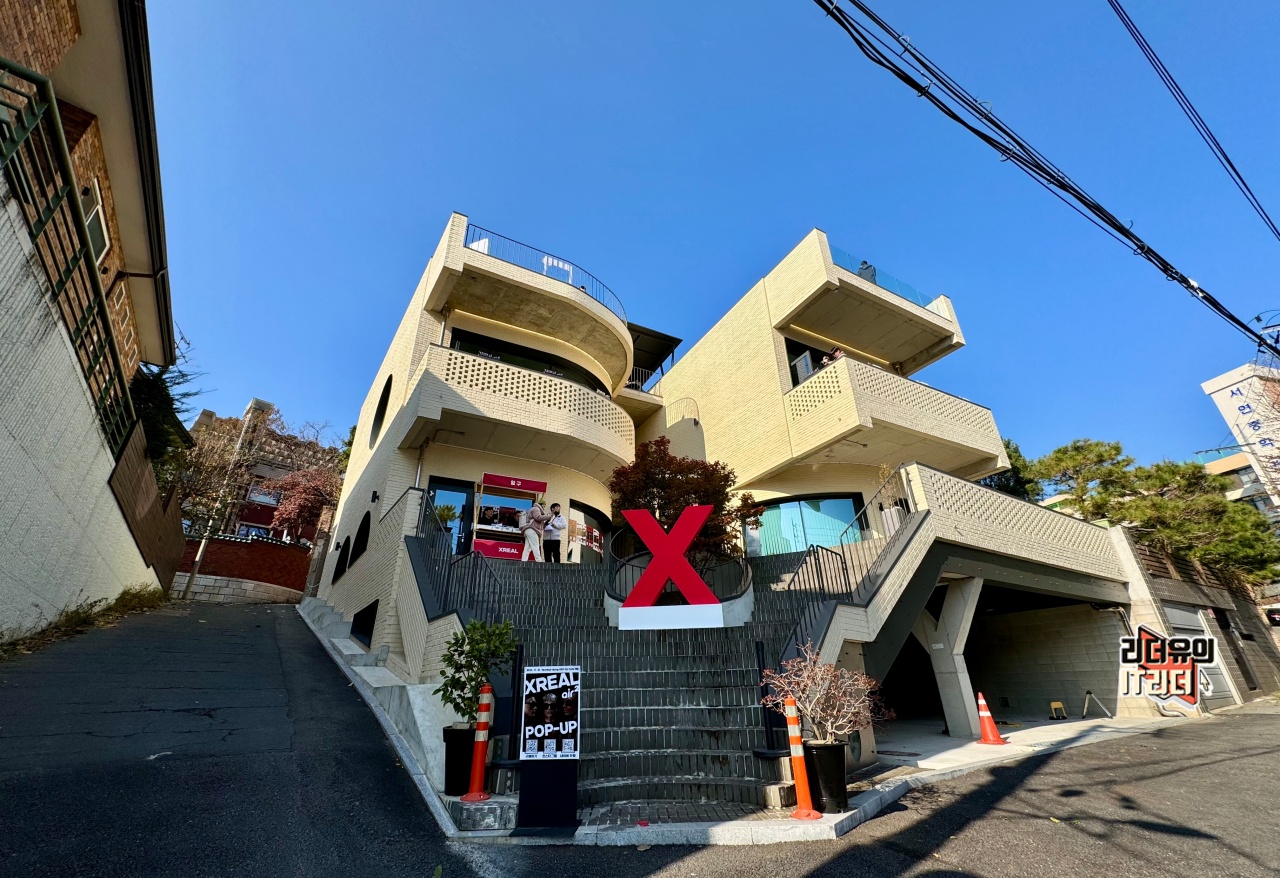 엑스리얼 에어2 (XREAL Air2) 팝업스토어는 핫플레이스인 연희동 아트힐에 꾸며졌습니다. 엑스리얼을 상징하는 X가 공간과 너무나 잘 어울리네요. 입체적인 건물 느낌이 AR글래스를 대표하는 엑스리얼 에어2의 이미지와 잘 어울리는 것 같습니다.